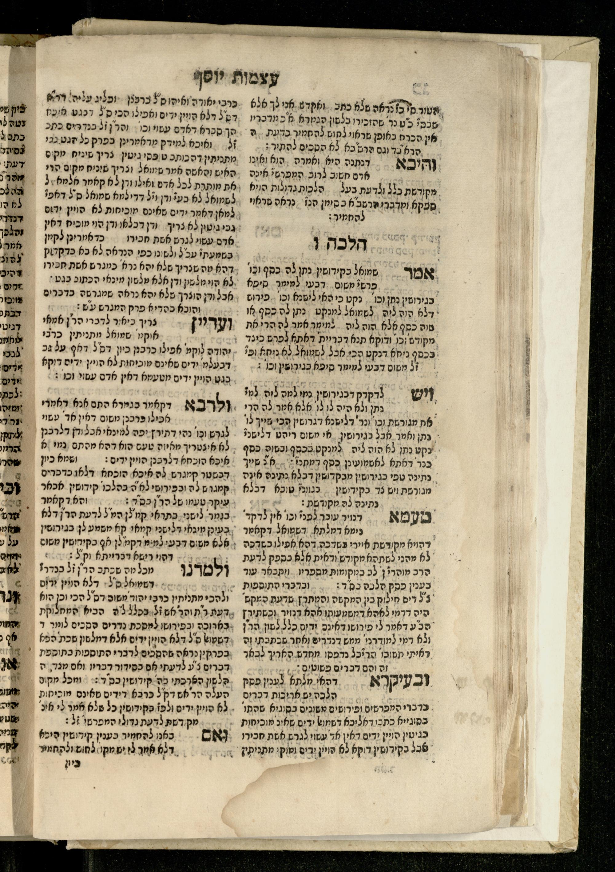 Sefer ʿAtsmot Yosef : ṿe-hu beʾur kelalim meḥudashim she-ha-Torah nidreshet ba-hem ... : gam ba ha-beʾur be-ʿiyun u-ve-filpul nimrats be-masekhet Ḳidushin mi-teḥilatah ʿad sofah ... gam ... be-sugyat Parah ṿe-Raḥel be-p. Kol ha-baśar u-ve-sof pereḳ Ketsad ha-regel ... / ḥibartiṿ ṿe-gam yisadtiṿ ani ha-tsaʿir Yosef ben Yitsḥaḳ ... n. ʿEzra ...ספר עצמות יוסף : והוא ביאור כללים מחודשים שהתורה נדרשת בהם ... : גם בא הבאור בעיון בעיון ובפלפול נמרץ במסכת קידושין מתחילתה עד סופה ... גם ... בסוגיית פרה ורחל בפ׳ כל הבשר ובסוף פרק כיצד הרגל ... / חברתיו וגם יסדתיו אני הצעיר יוסף בן יצחק ... ן׳ עזרא ...