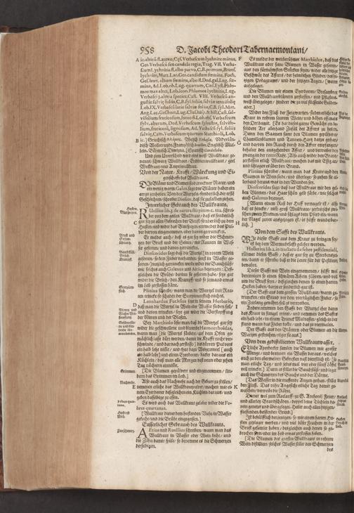 D. Jacobi Theodori Tabernaemontani, Neu vollkommen Kräuter-Buch : Darinnen Uber 3000. Kräuter/ mit schönen und kunstlichen Figuren/ auch deren Underscheid und Würckung/ samt ihren Namen in mancherley Sprachen/ beschrieben: Desgleichen auch/ wie dieselbige in allerhand Kranckheiten/ beyde der Menschen und des Viehs/ sollen angewendet und gebraucht werden/ angezeigt wird. Erstlichen durch Casparum Bauhinum D. und Profess. Basil. mit vielen neuen Figuren/ nutzlichen Artzneyen/ und anderem/ mit sonderem Fleis gebesseret/ Zum Andern Durch Hieronymum Bauhinum D. und Profess. Basil. mit sehr nutzlichen Marginalien, Synonimis, neuen Registeren und anderem vermehrt