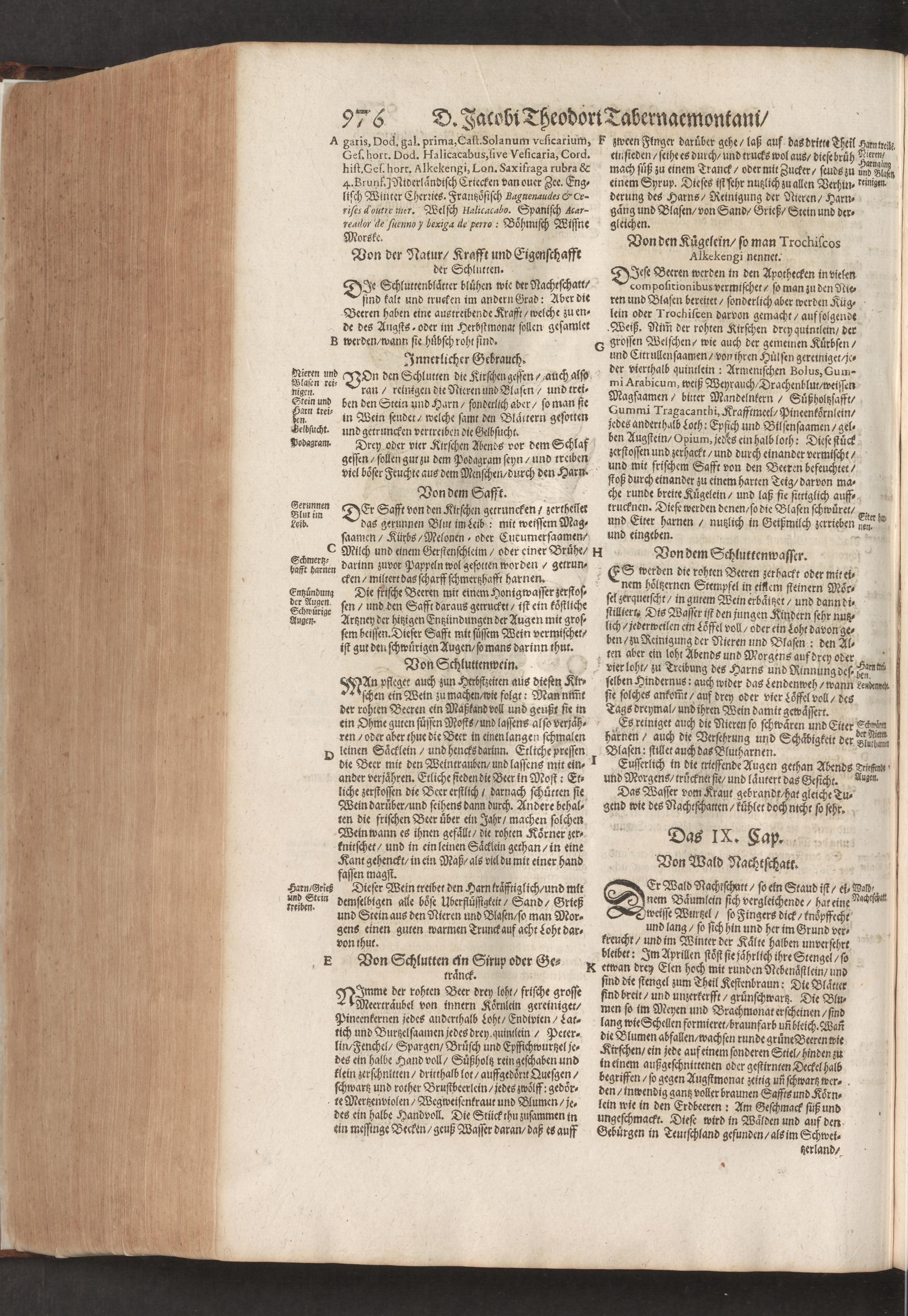 D. Jacobi Theodori Tabernaemontani, Neu vollkommen Kräuter-Buch : Darinnen Uber 3000. Kräuter/ mit schönen und kunstlichen Figuren/ auch deren Underscheid und Würckung/ samt ihren Namen in mancherley Sprachen/ beschrieben: Desgleichen auch/ wie dieselbige in allerhand Kranckheiten/ beyde der Menschen und des Viehs/ sollen angewendet und gebraucht werden/ angezeigt wird. Erstlichen durch Casparum Bauhinum D. und Profess. Basil. mit vielen neuen Figuren/ nutzlichen Artzneyen/ und anderem/ mit sonderem Fleis gebesseret/ Zum Andern Durch Hieronymum Bauhinum D. und Profess. Basil. mit sehr nutzlichen Marginalien, Synonimis, neuen Registeren und anderem vermehrt