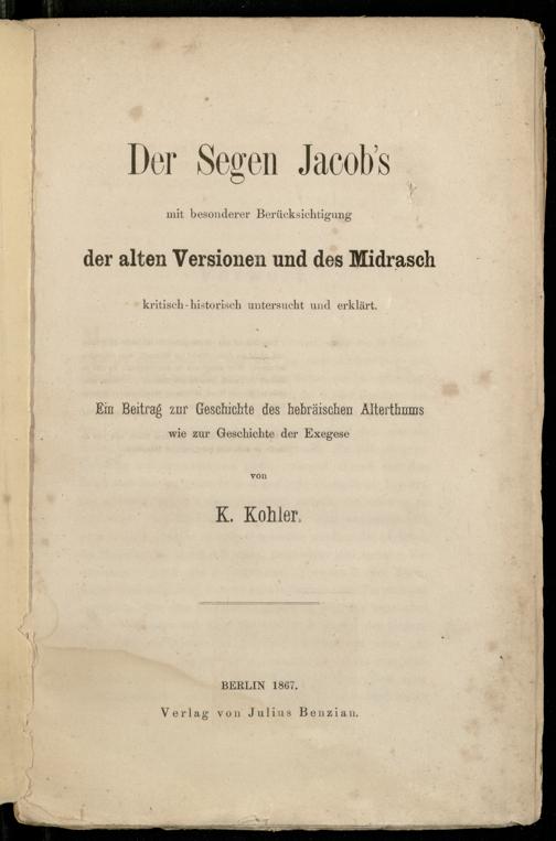 Der Segen Jacob's mit besonderer Berücksichtigung der alten Versionen und des Midrasch kritisch-historisch untersucht und erklärt : ein Beitrag zur Geschichte des hebräischen Alterthums wie zur Geschichte der Exegese / von K. Kohler
