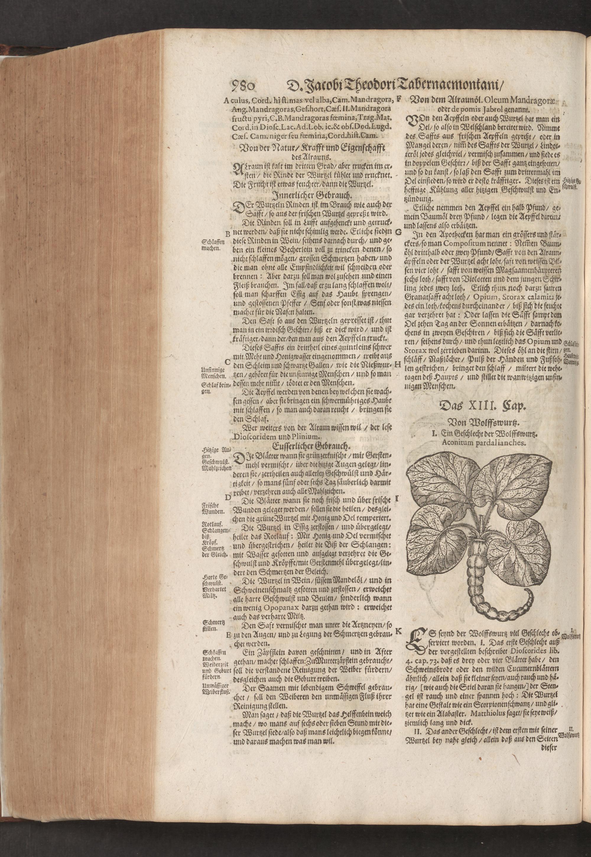 D. Jacobi Theodori Tabernaemontani, Neu vollkommen Kräuter-Buch : Darinnen Uber 3000. Kräuter/ mit schönen und kunstlichen Figuren/ auch deren Underscheid und Würckung/ samt ihren Namen in mancherley Sprachen/ beschrieben: Desgleichen auch/ wie dieselbige in allerhand Kranckheiten/ beyde der Menschen und des Viehs/ sollen angewendet und gebraucht werden/ angezeigt wird. Erstlichen durch Casparum Bauhinum D. und Profess. Basil. mit vielen neuen Figuren/ nutzlichen Artzneyen/ und anderem/ mit sonderem Fleis gebesseret/ Zum Andern Durch Hieronymum Bauhinum D. und Profess. Basil. mit sehr nutzlichen Marginalien, Synonimis, neuen Registeren und anderem vermehrt