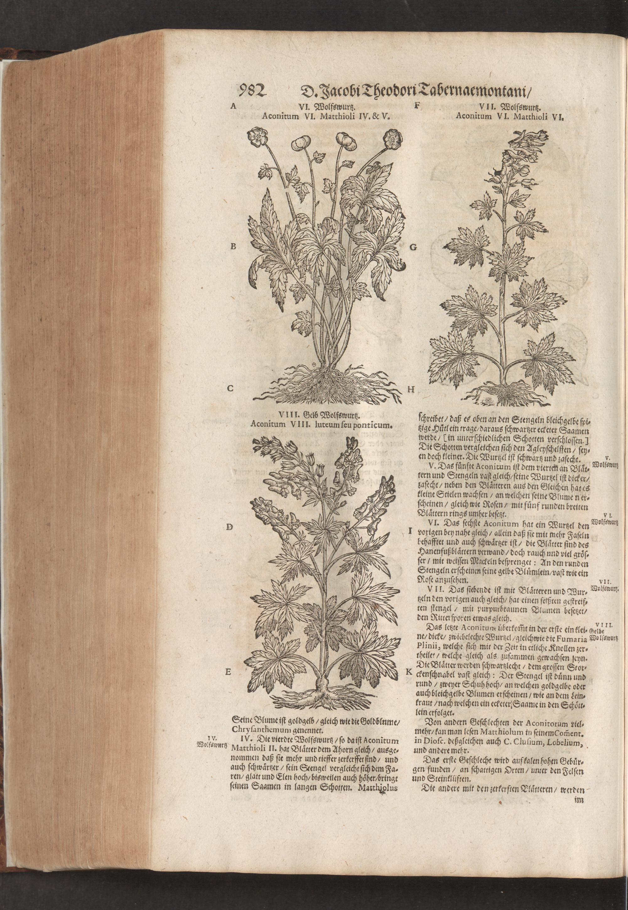 D. Jacobi Theodori Tabernaemontani, Neu vollkommen Kräuter-Buch : Darinnen Uber 3000. Kräuter/ mit schönen und kunstlichen Figuren/ auch deren Underscheid und Würckung/ samt ihren Namen in mancherley Sprachen/ beschrieben: Desgleichen auch/ wie dieselbige in allerhand Kranckheiten/ beyde der Menschen und des Viehs/ sollen angewendet und gebraucht werden/ angezeigt wird. Erstlichen durch Casparum Bauhinum D. und Profess. Basil. mit vielen neuen Figuren/ nutzlichen Artzneyen/ und anderem/ mit sonderem Fleis gebesseret/ Zum Andern Durch Hieronymum Bauhinum D. und Profess. Basil. mit sehr nutzlichen Marginalien, Synonimis, neuen Registeren und anderem vermehrt