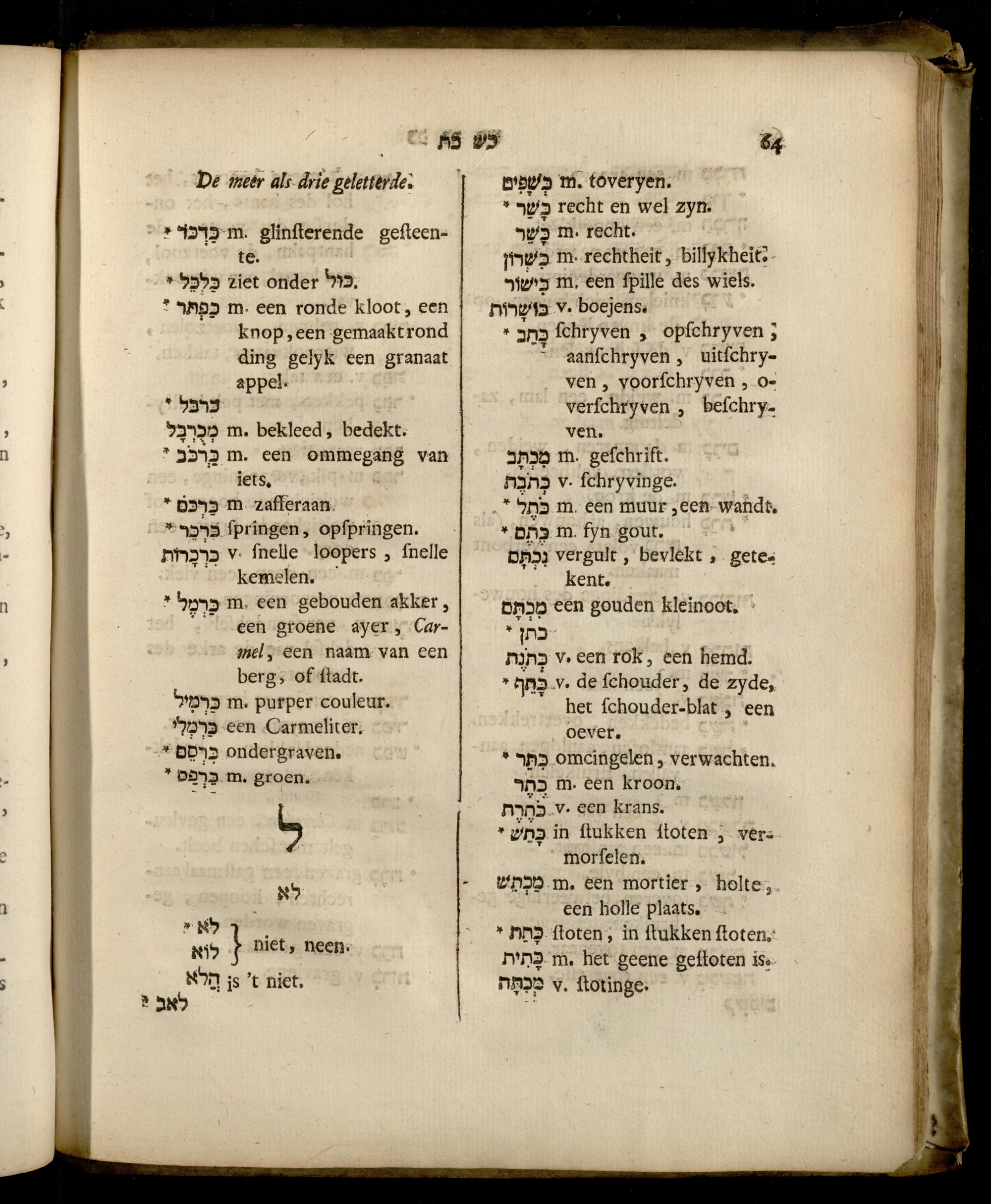 De bruidschat Israels, of onderwys der Hebreeuwsche spraakkunst : met twee Bygevoegde Woordenboeken / opgestelt door Eleasar Soesman. Voorzien met een Getuigschrift van den Hooggeleerden Heer Cornelius Hugo Vonk