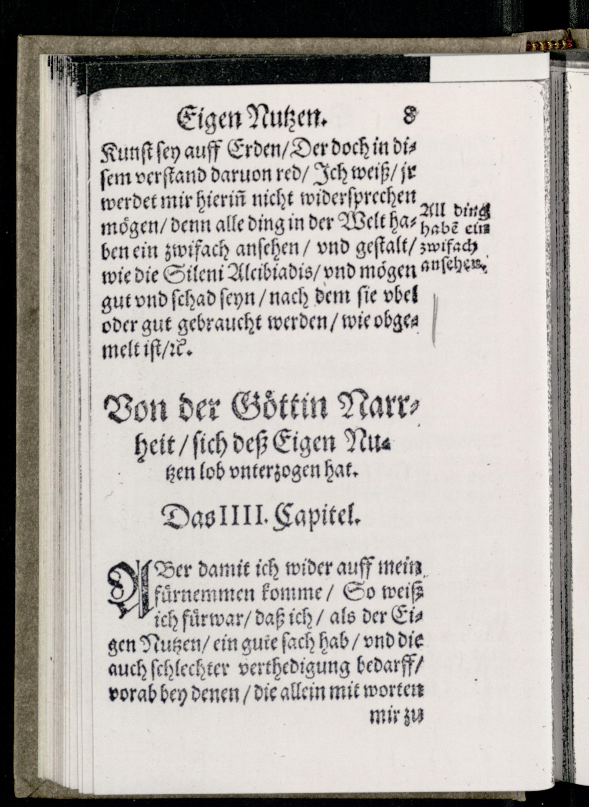 Von der Göttin Narrheit/ sich deß Eigen Nutzen lob unterzogen hat. Das III. Capitel.