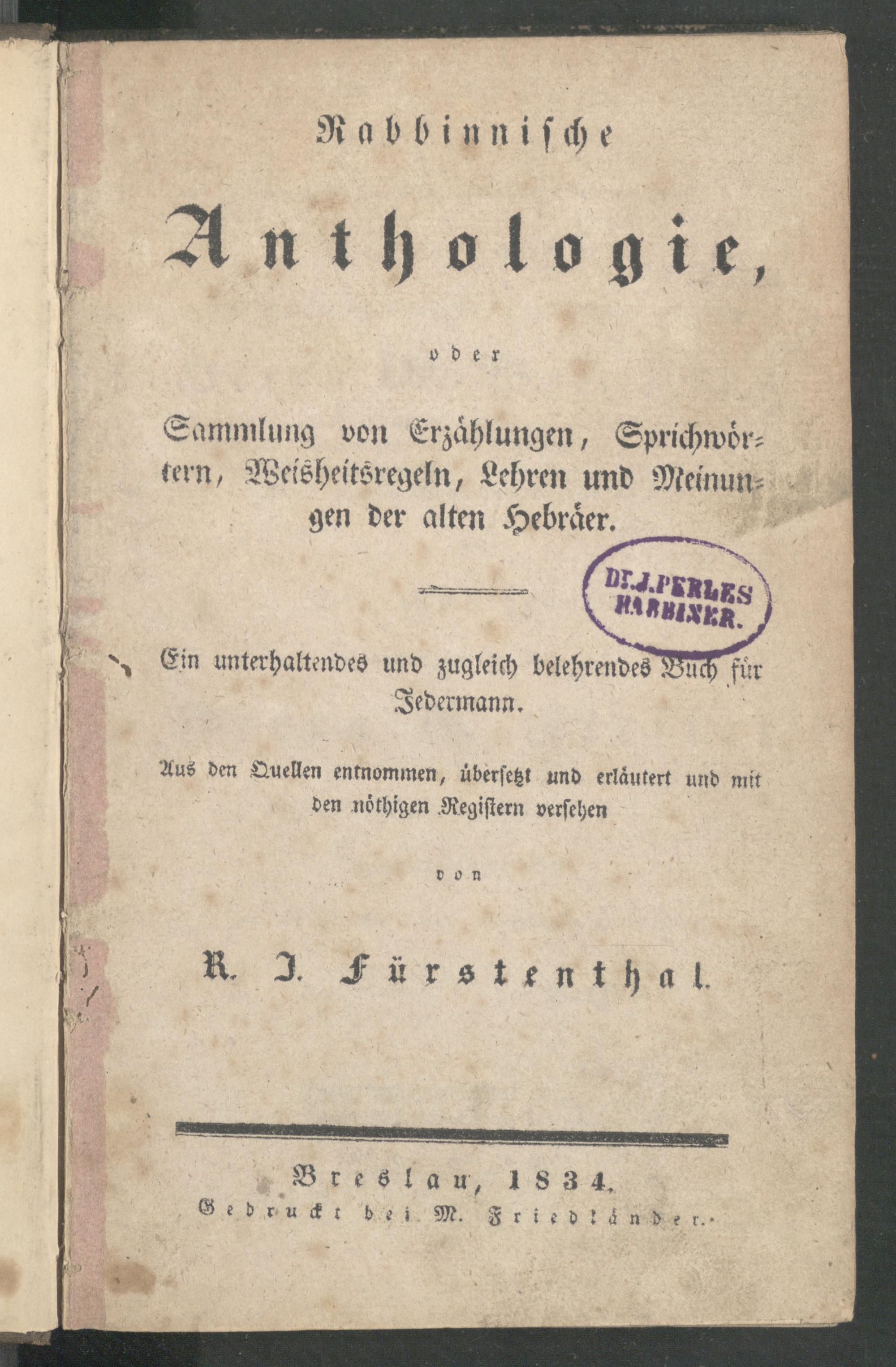 Rabbinnische [!] Anthologie, oder Sammlung von Erzählungen, Sprichwörtern, Weisheitsregeln, Lehren und Meinungen der alten Hebräer ; Ein unterhaltendes und zugleich belehrendes Buch für Jedermann / Aus den Quellen entnommen, übersetzt und erläutert und mit den nöthigen Registern versehen von R[aphael] J[acob] Fürstenthal