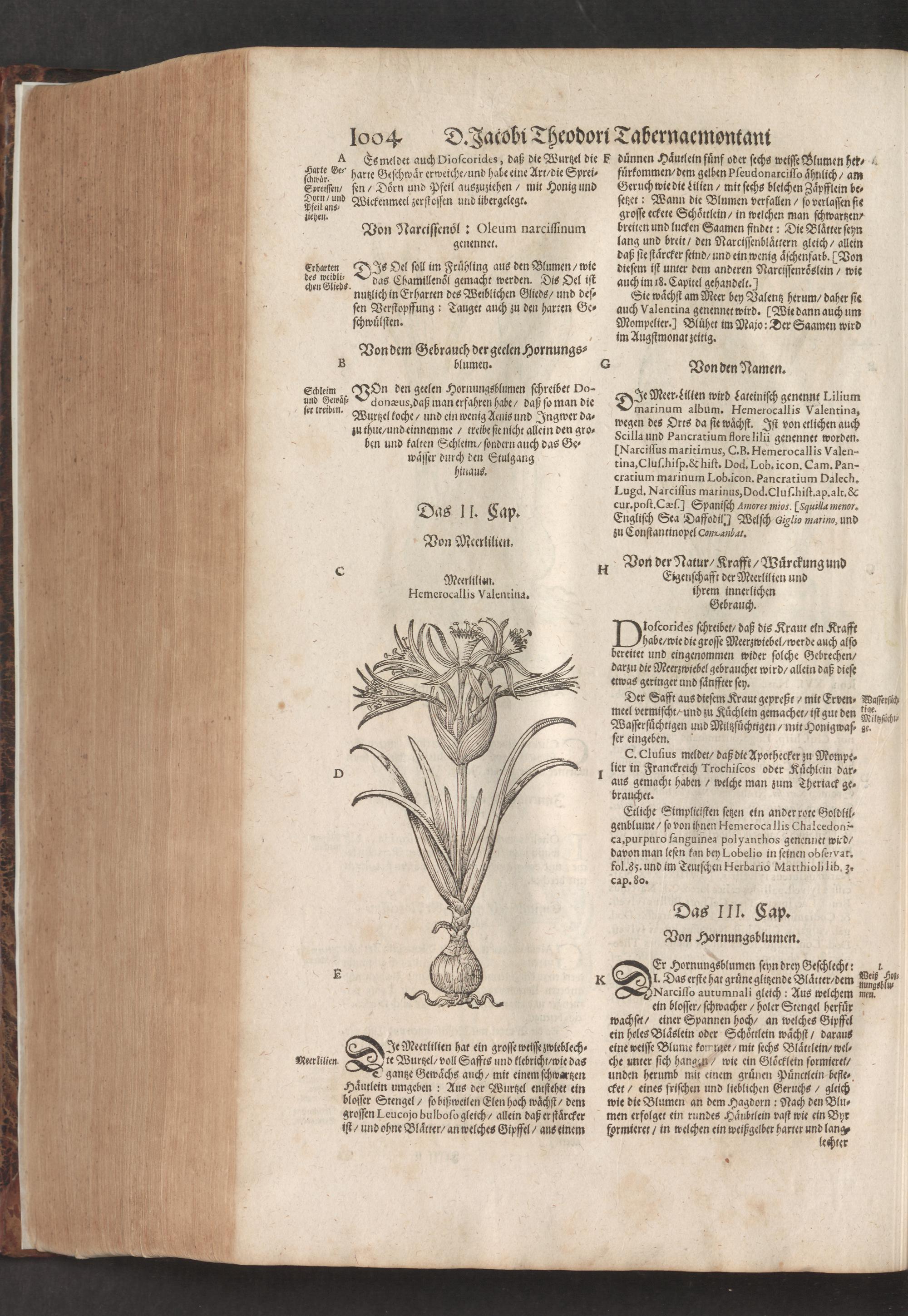 D. Jacobi Theodori Tabernaemontani, Neu vollkommen Kräuter-Buch : Darinnen Uber 3000. Kräuter/ mit schönen und kunstlichen Figuren/ auch deren Underscheid und Würckung/ samt ihren Namen in mancherley Sprachen/ beschrieben: Desgleichen auch/ wie dieselbige in allerhand Kranckheiten/ beyde der Menschen und des Viehs/ sollen angewendet und gebraucht werden/ angezeigt wird. Erstlichen durch Casparum Bauhinum D. und Profess. Basil. mit vielen neuen Figuren/ nutzlichen Artzneyen/ und anderem/ mit sonderem Fleis gebesseret/ Zum Andern Durch Hieronymum Bauhinum D. und Profess. Basil. mit sehr nutzlichen Marginalien, Synonimis, neuen Registeren und anderem vermehrt