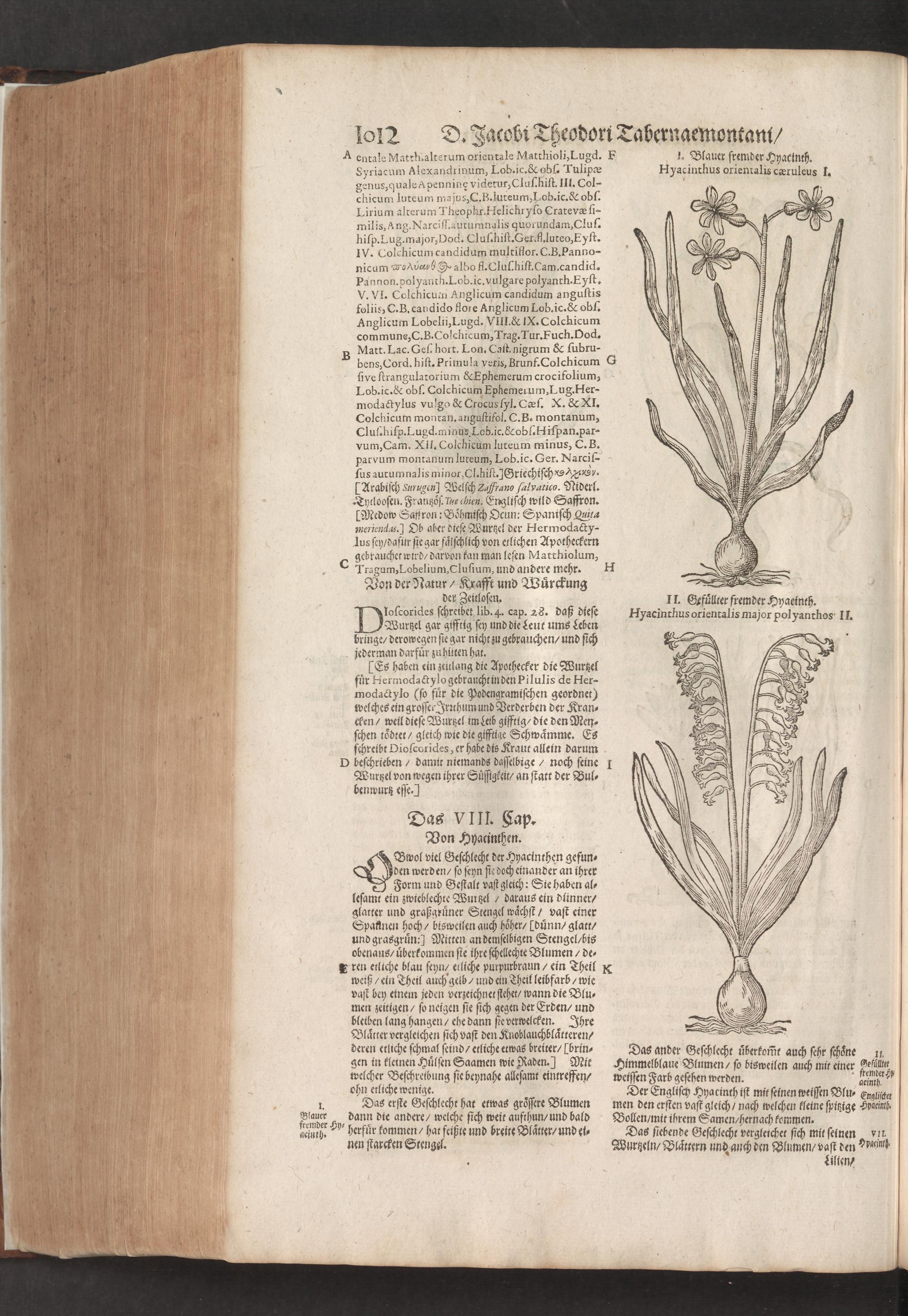 D. Jacobi Theodori Tabernaemontani, Neu vollkommen Kräuter-Buch : Darinnen Uber 3000. Kräuter/ mit schönen und kunstlichen Figuren/ auch deren Underscheid und Würckung/ samt ihren Namen in mancherley Sprachen/ beschrieben: Desgleichen auch/ wie dieselbige in allerhand Kranckheiten/ beyde der Menschen und des Viehs/ sollen angewendet und gebraucht werden/ angezeigt wird. Erstlichen durch Casparum Bauhinum D. und Profess. Basil. mit vielen neuen Figuren/ nutzlichen Artzneyen/ und anderem/ mit sonderem Fleis gebesseret/ Zum Andern Durch Hieronymum Bauhinum D. und Profess. Basil. mit sehr nutzlichen Marginalien, Synonimis, neuen Registeren und anderem vermehrt