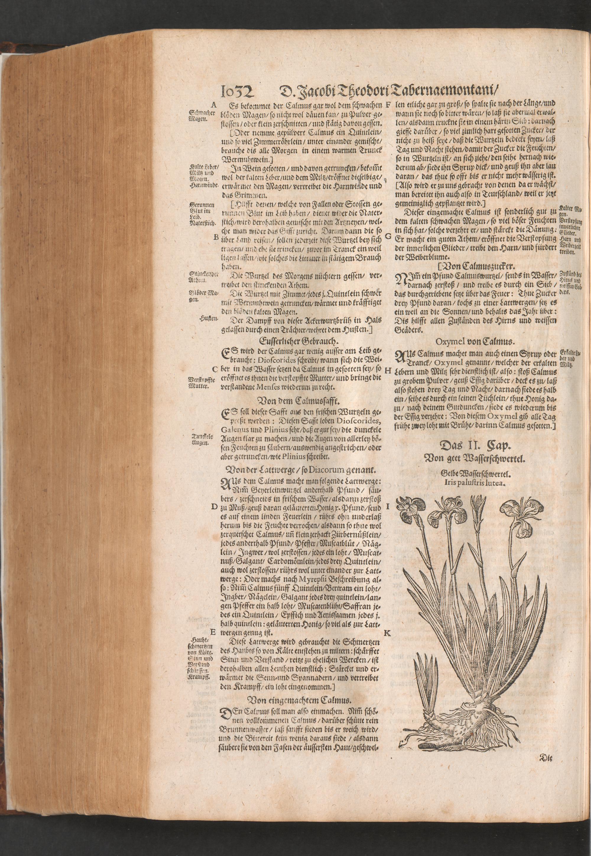 D. Jacobi Theodori Tabernaemontani, Neu vollkommen Kräuter-Buch : Darinnen Uber 3000. Kräuter/ mit schönen und kunstlichen Figuren/ auch deren Underscheid und Würckung/ samt ihren Namen in mancherley Sprachen/ beschrieben: Desgleichen auch/ wie dieselbige in allerhand Kranckheiten/ beyde der Menschen und des Viehs/ sollen angewendet und gebraucht werden/ angezeigt wird. Erstlichen durch Casparum Bauhinum D. und Profess. Basil. mit vielen neuen Figuren/ nutzlichen Artzneyen/ und anderem/ mit sonderem Fleis gebesseret/ Zum Andern Durch Hieronymum Bauhinum D. und Profess. Basil. mit sehr nutzlichen Marginalien, Synonimis, neuen Registeren und anderem vermehrt