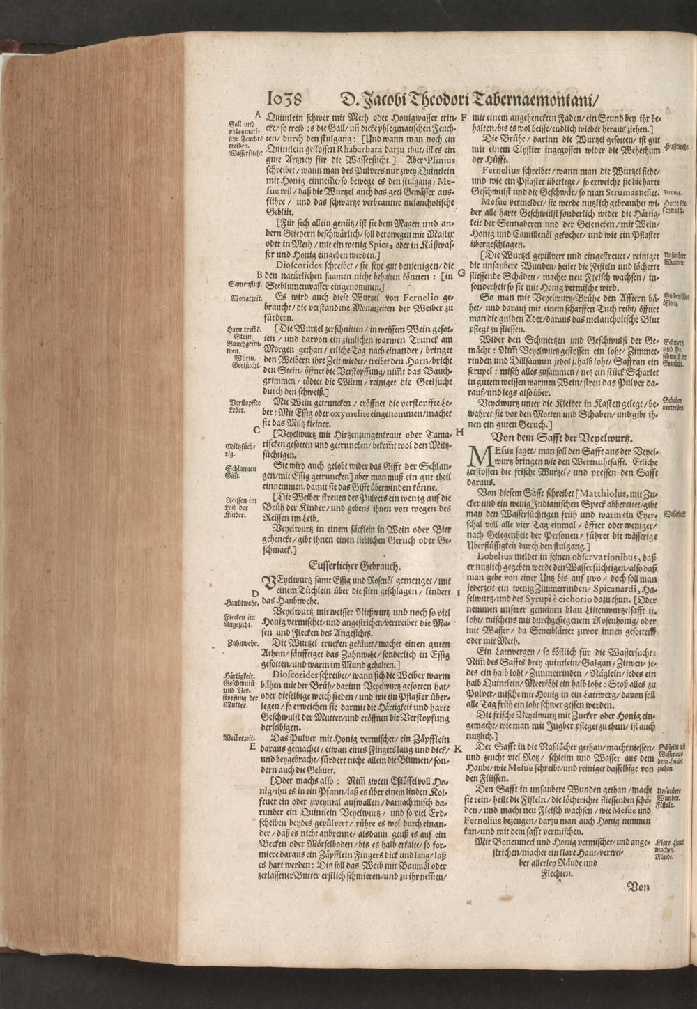 D. Jacobi Theodori Tabernaemontani, Neu vollkommen Kräuter-Buch : Darinnen Uber 3000. Kräuter/ mit schönen und kunstlichen Figuren/ auch deren Underscheid und Würckung/ samt ihren Namen in mancherley Sprachen/ beschrieben: Desgleichen auch/ wie dieselbige in allerhand Kranckheiten/ beyde der Menschen und des Viehs/ sollen angewendet und gebraucht werden/ angezeigt wird. Erstlichen durch Casparum Bauhinum D. und Profess. Basil. mit vielen neuen Figuren/ nutzlichen Artzneyen/ und anderem/ mit sonderem Fleis gebesseret/ Zum Andern Durch Hieronymum Bauhinum D. und Profess. Basil. mit sehr nutzlichen Marginalien, Synonimis, neuen Registeren und anderem vermehrt