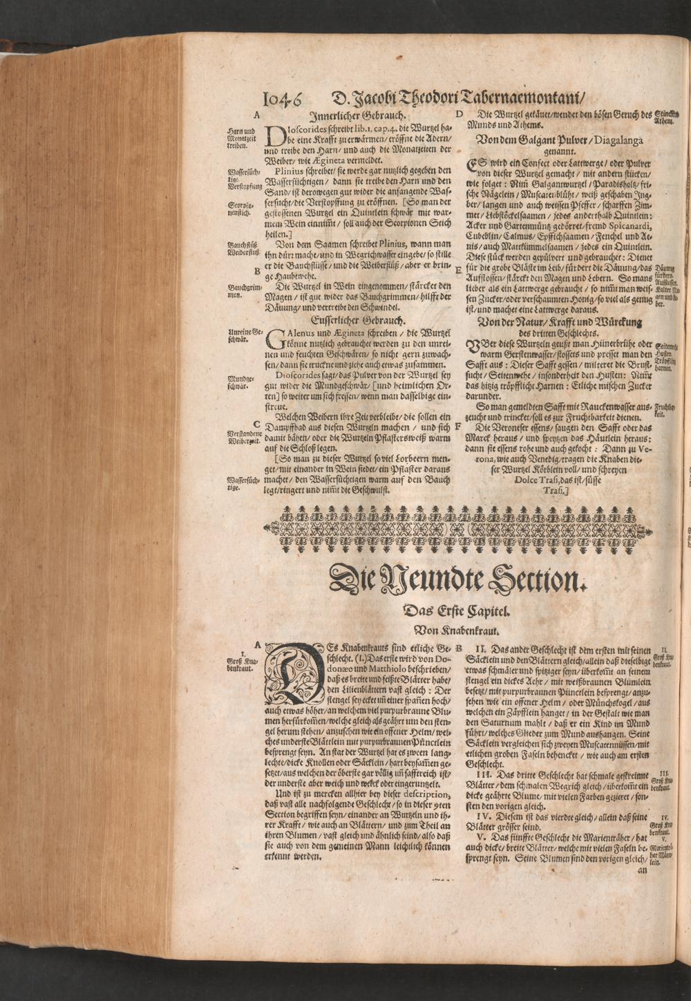 D. Jacobi Theodori Tabernaemontani, Neu vollkommen Kräuter-Buch : Darinnen Uber 3000. Kräuter/ mit schönen und kunstlichen Figuren/ auch deren Underscheid und Würckung/ samt ihren Namen in mancherley Sprachen/ beschrieben: Desgleichen auch/ wie dieselbige in allerhand Kranckheiten/ beyde der Menschen und des Viehs/ sollen angewendet und gebraucht werden/ angezeigt wird. Erstlichen durch Casparum Bauhinum D. und Profess. Basil. mit vielen neuen Figuren/ nutzlichen Artzneyen/ und anderem/ mit sonderem Fleis gebesseret/ Zum Andern Durch Hieronymum Bauhinum D. und Profess. Basil. mit sehr nutzlichen Marginalien, Synonimis, neuen Registeren und anderem vermehrt
