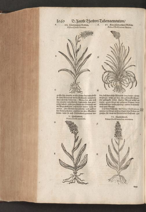 D. Jacobi Theodori Tabernaemontani, Neu vollkommen Kräuter-Buch : Darinnen Uber 3000. Kräuter/ mit schönen und kunstlichen Figuren/ auch deren Underscheid und Würckung/ samt ihren Namen in mancherley Sprachen/ beschrieben: Desgleichen auch/ wie dieselbige in allerhand Kranckheiten/ beyde der Menschen und des Viehs/ sollen angewendet und gebraucht werden/ angezeigt wird. Erstlichen durch Casparum Bauhinum D. und Profess. Basil. mit vielen neuen Figuren/ nutzlichen Artzneyen/ und anderem/ mit sonderem Fleis gebesseret/ Zum Andern Durch Hieronymum Bauhinum D. und Profess. Basil. mit sehr nutzlichen Marginalien, Synonimis, neuen Registeren und anderem vermehrt