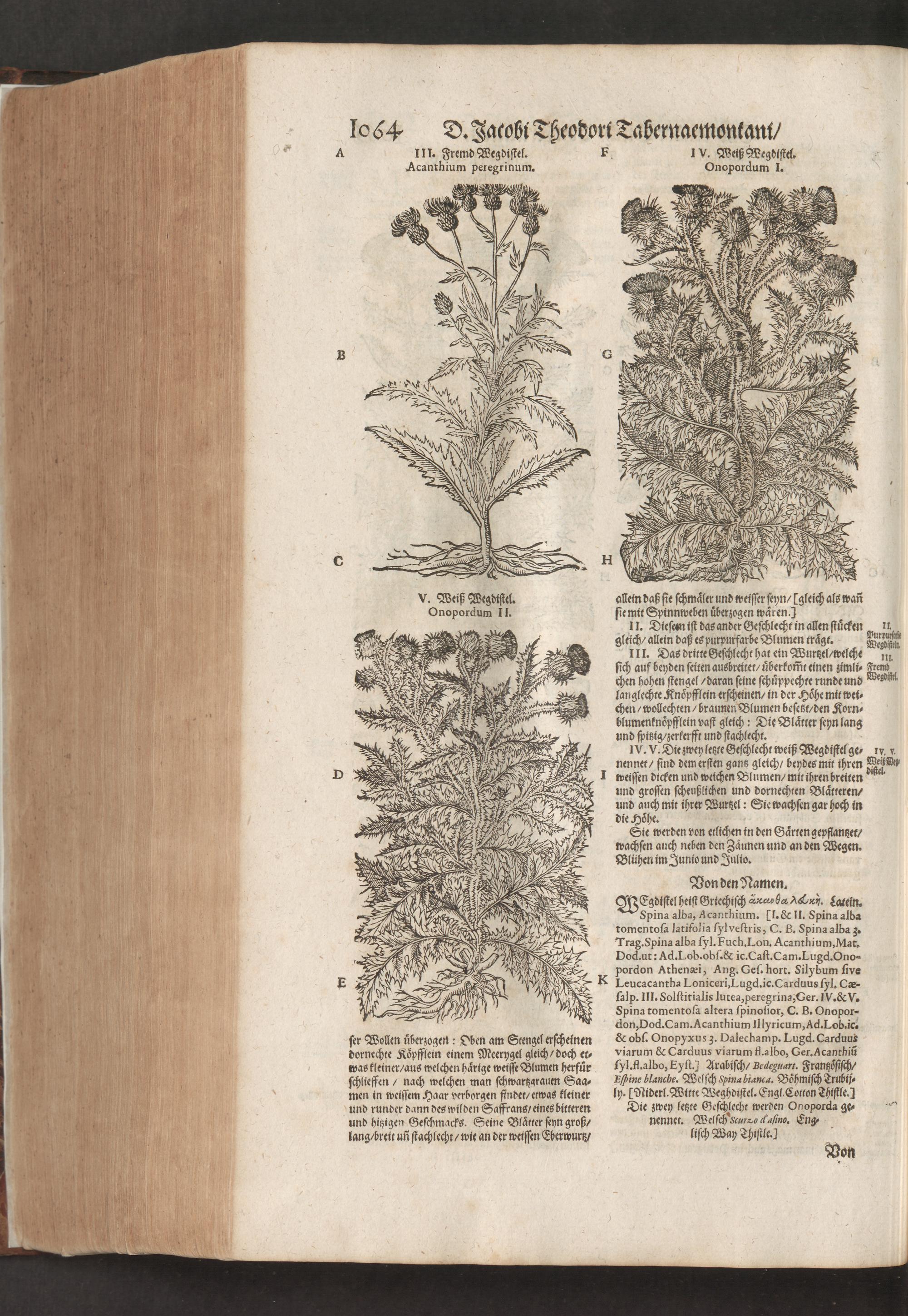 D. Jacobi Theodori Tabernaemontani, Neu vollkommen Kräuter-Buch : Darinnen Uber 3000. Kräuter/ mit schönen und kunstlichen Figuren/ auch deren Underscheid und Würckung/ samt ihren Namen in mancherley Sprachen/ beschrieben: Desgleichen auch/ wie dieselbige in allerhand Kranckheiten/ beyde der Menschen und des Viehs/ sollen angewendet und gebraucht werden/ angezeigt wird. Erstlichen durch Casparum Bauhinum D. und Profess. Basil. mit vielen neuen Figuren/ nutzlichen Artzneyen/ und anderem/ mit sonderem Fleis gebesseret/ Zum Andern Durch Hieronymum Bauhinum D. und Profess. Basil. mit sehr nutzlichen Marginalien, Synonimis, neuen Registeren und anderem vermehrt