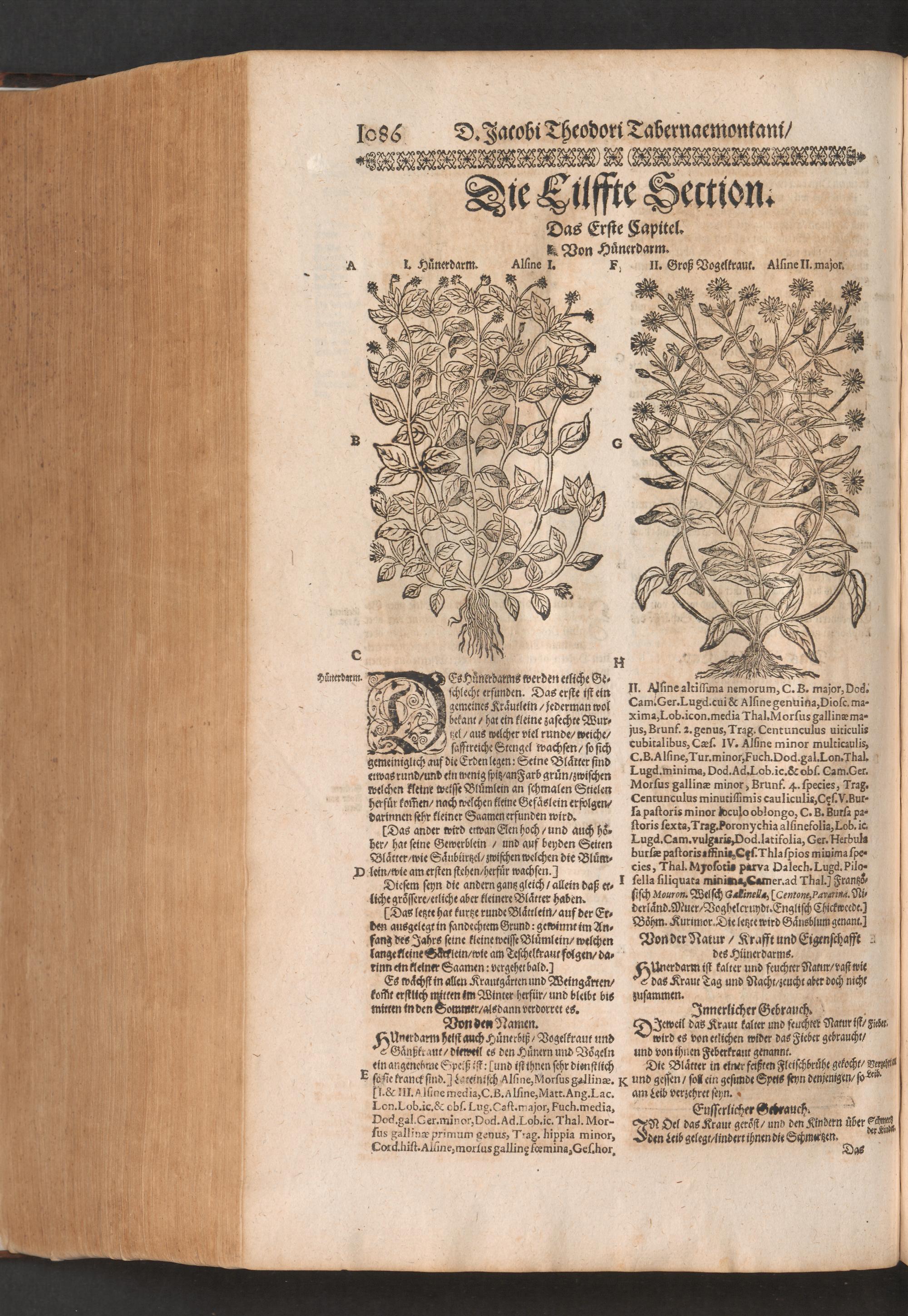 D. Jacobi Theodori Tabernaemontani, Neu vollkommen Kräuter-Buch : Darinnen Uber 3000. Kräuter/ mit schönen und kunstlichen Figuren/ auch deren Underscheid und Würckung/ samt ihren Namen in mancherley Sprachen/ beschrieben: Desgleichen auch/ wie dieselbige in allerhand Kranckheiten/ beyde der Menschen und des Viehs/ sollen angewendet und gebraucht werden/ angezeigt wird. Erstlichen durch Casparum Bauhinum D. und Profess. Basil. mit vielen neuen Figuren/ nutzlichen Artzneyen/ und anderem/ mit sonderem Fleis gebesseret/ Zum Andern Durch Hieronymum Bauhinum D. und Profess. Basil. mit sehr nutzlichen Marginalien, Synonimis, neuen Registeren und anderem vermehrt
