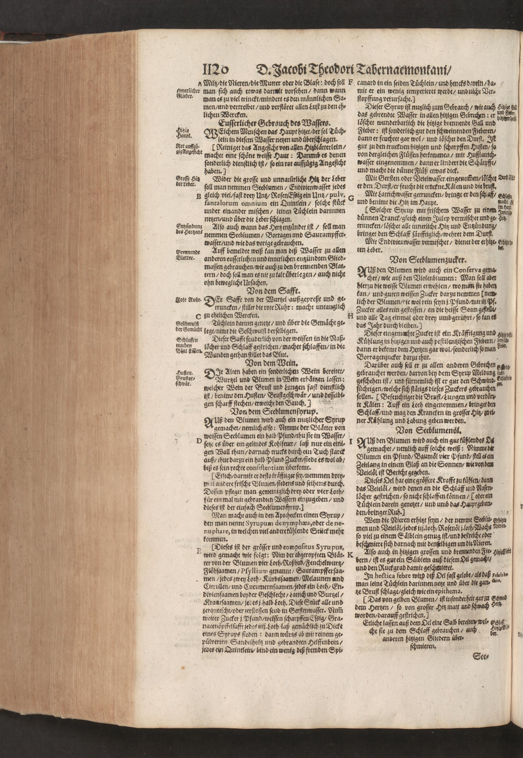 D. Jacobi Theodori Tabernaemontani, Neu vollkommen Kräuter-Buch : Darinnen Uber 3000. Kräuter/ mit schönen und kunstlichen Figuren/ auch deren Underscheid und Würckung/ samt ihren Namen in mancherley Sprachen/ beschrieben: Desgleichen auch/ wie dieselbige in allerhand Kranckheiten/ beyde der Menschen und des Viehs/ sollen angewendet und gebraucht werden/ angezeigt wird. Erstlichen durch Casparum Bauhinum D. und Profess. Basil. mit vielen neuen Figuren/ nutzlichen Artzneyen/ und anderem/ mit sonderem Fleis gebesseret/ Zum Andern Durch Hieronymum Bauhinum D. und Profess. Basil. mit sehr nutzlichen Marginalien, Synonimis, neuen Registeren und anderem vermehrt