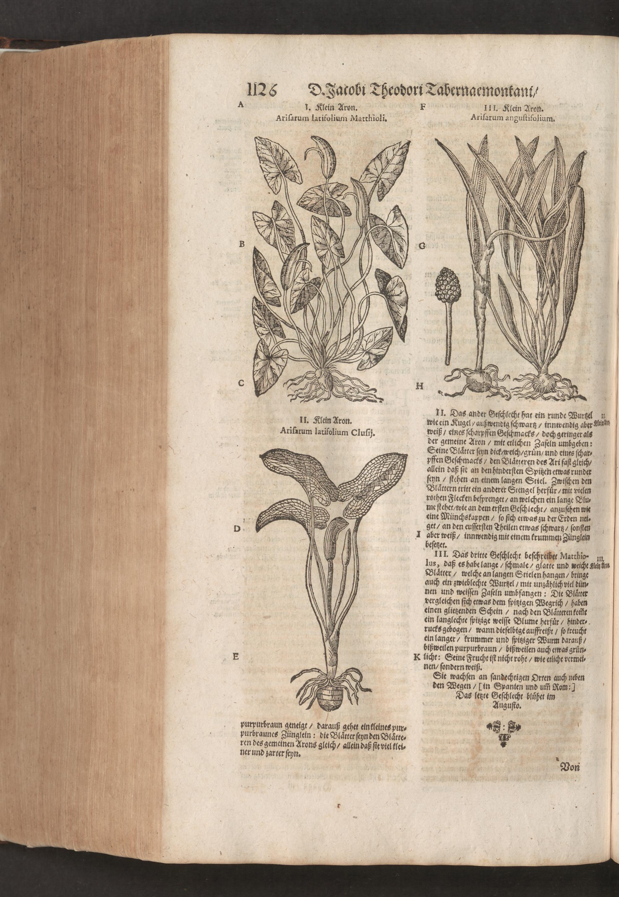 D. Jacobi Theodori Tabernaemontani, Neu vollkommen Kräuter-Buch : Darinnen Uber 3000. Kräuter/ mit schönen und kunstlichen Figuren/ auch deren Underscheid und Würckung/ samt ihren Namen in mancherley Sprachen/ beschrieben: Desgleichen auch/ wie dieselbige in allerhand Kranckheiten/ beyde der Menschen und des Viehs/ sollen angewendet und gebraucht werden/ angezeigt wird. Erstlichen durch Casparum Bauhinum D. und Profess. Basil. mit vielen neuen Figuren/ nutzlichen Artzneyen/ und anderem/ mit sonderem Fleis gebesseret/ Zum Andern Durch Hieronymum Bauhinum D. und Profess. Basil. mit sehr nutzlichen Marginalien, Synonimis, neuen Registeren und anderem vermehrt