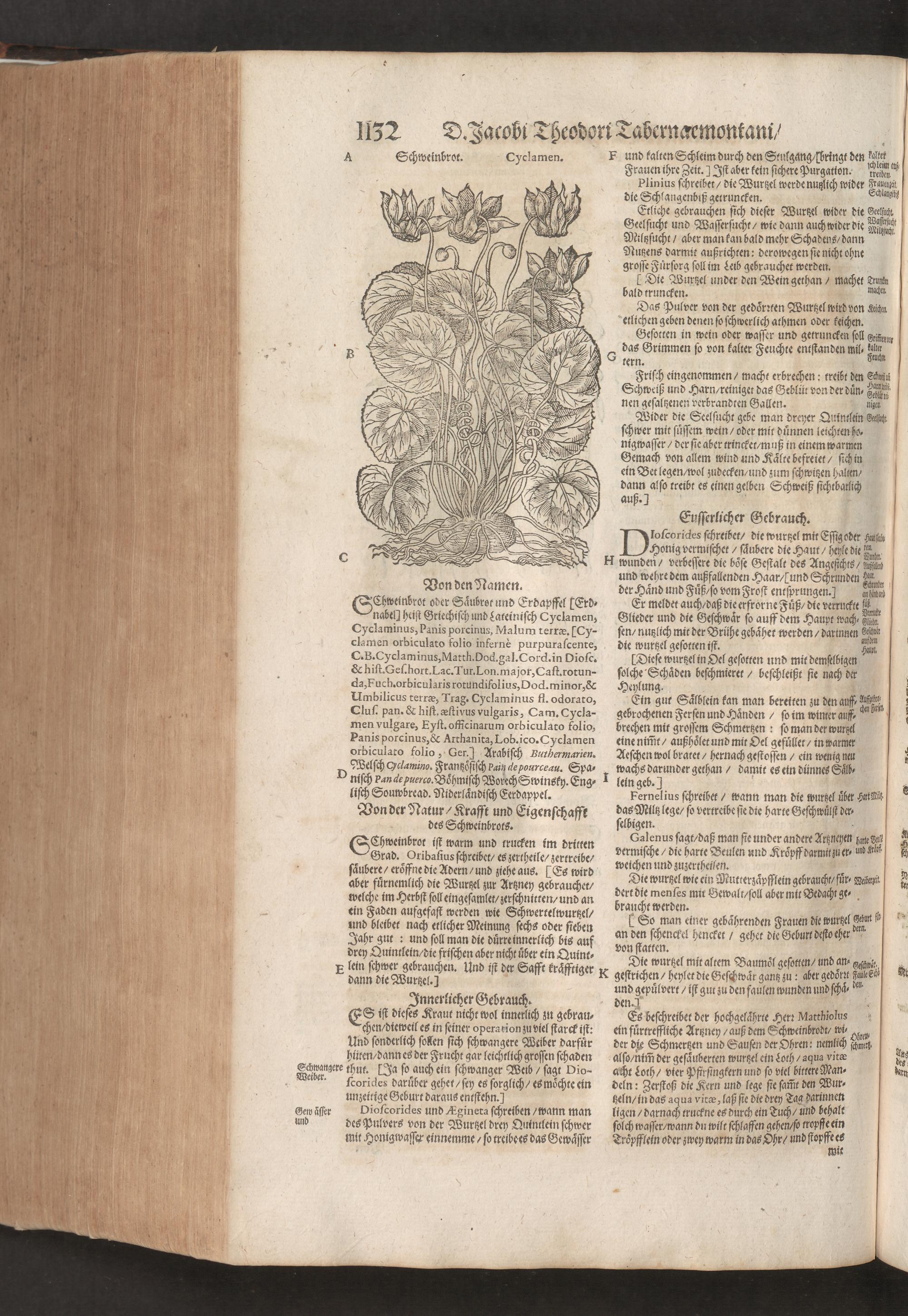 D. Jacobi Theodori Tabernaemontani, Neu vollkommen Kräuter-Buch : Darinnen Uber 3000. Kräuter/ mit schönen und kunstlichen Figuren/ auch deren Underscheid und Würckung/ samt ihren Namen in mancherley Sprachen/ beschrieben: Desgleichen auch/ wie dieselbige in allerhand Kranckheiten/ beyde der Menschen und des Viehs/ sollen angewendet und gebraucht werden/ angezeigt wird. Erstlichen durch Casparum Bauhinum D. und Profess. Basil. mit vielen neuen Figuren/ nutzlichen Artzneyen/ und anderem/ mit sonderem Fleis gebesseret/ Zum Andern Durch Hieronymum Bauhinum D. und Profess. Basil. mit sehr nutzlichen Marginalien, Synonimis, neuen Registeren und anderem vermehrt