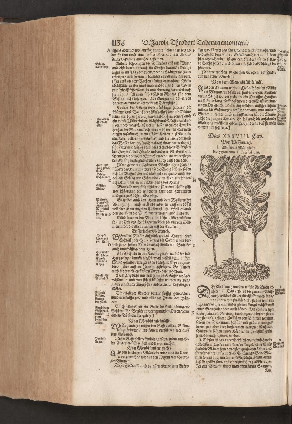 D. Jacobi Theodori Tabernaemontani, Neu vollkommen Kräuter-Buch : Darinnen Uber 3000. Kräuter/ mit schönen und kunstlichen Figuren/ auch deren Underscheid und Würckung/ samt ihren Namen in mancherley Sprachen/ beschrieben: Desgleichen auch/ wie dieselbige in allerhand Kranckheiten/ beyde der Menschen und des Viehs/ sollen angewendet und gebraucht werden/ angezeigt wird. Erstlichen durch Casparum Bauhinum D. und Profess. Basil. mit vielen neuen Figuren/ nutzlichen Artzneyen/ und anderem/ mit sonderem Fleis gebesseret/ Zum Andern Durch Hieronymum Bauhinum D. und Profess. Basil. mit sehr nutzlichen Marginalien, Synonimis, neuen Registeren und anderem vermehrt