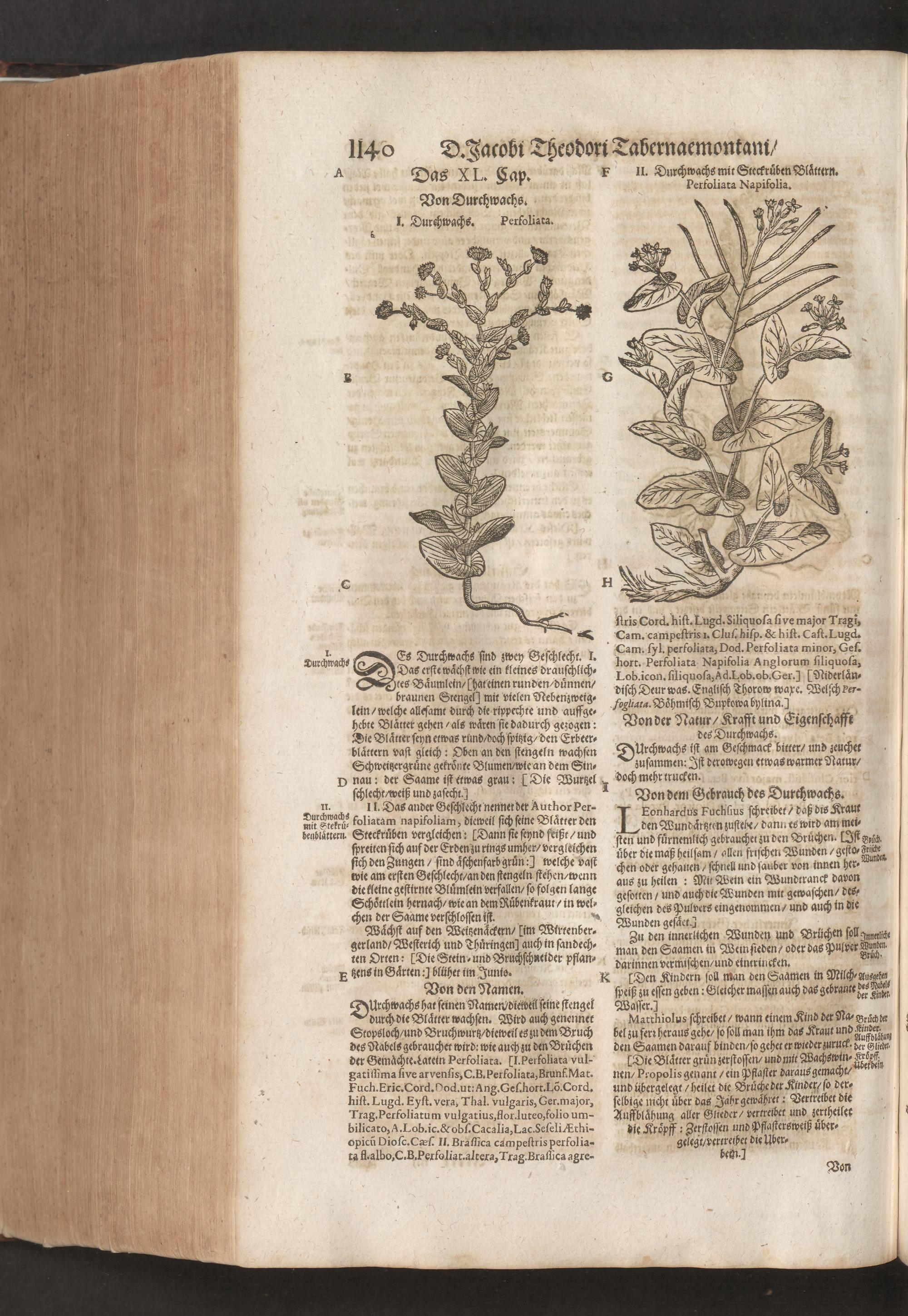 D. Jacobi Theodori Tabernaemontani, Neu vollkommen Kräuter-Buch : Darinnen Uber 3000. Kräuter/ mit schönen und kunstlichen Figuren/ auch deren Underscheid und Würckung/ samt ihren Namen in mancherley Sprachen/ beschrieben: Desgleichen auch/ wie dieselbige in allerhand Kranckheiten/ beyde der Menschen und des Viehs/ sollen angewendet und gebraucht werden/ angezeigt wird. Erstlichen durch Casparum Bauhinum D. und Profess. Basil. mit vielen neuen Figuren/ nutzlichen Artzneyen/ und anderem/ mit sonderem Fleis gebesseret/ Zum Andern Durch Hieronymum Bauhinum D. und Profess. Basil. mit sehr nutzlichen Marginalien, Synonimis, neuen Registeren und anderem vermehrt