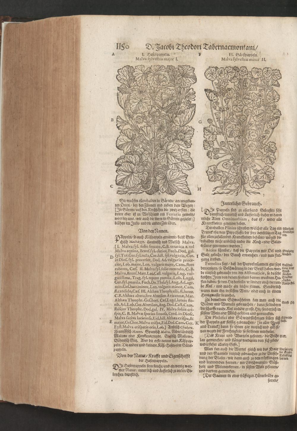 D. Jacobi Theodori Tabernaemontani, Neu vollkommen Kräuter-Buch : Darinnen Uber 3000. Kräuter/ mit schönen und kunstlichen Figuren/ auch deren Underscheid und Würckung/ samt ihren Namen in mancherley Sprachen/ beschrieben: Desgleichen auch/ wie dieselbige in allerhand Kranckheiten/ beyde der Menschen und des Viehs/ sollen angewendet und gebraucht werden/ angezeigt wird. Erstlichen durch Casparum Bauhinum D. und Profess. Basil. mit vielen neuen Figuren/ nutzlichen Artzneyen/ und anderem/ mit sonderem Fleis gebesseret/ Zum Andern Durch Hieronymum Bauhinum D. und Profess. Basil. mit sehr nutzlichen Marginalien, Synonimis, neuen Registeren und anderem vermehrt
