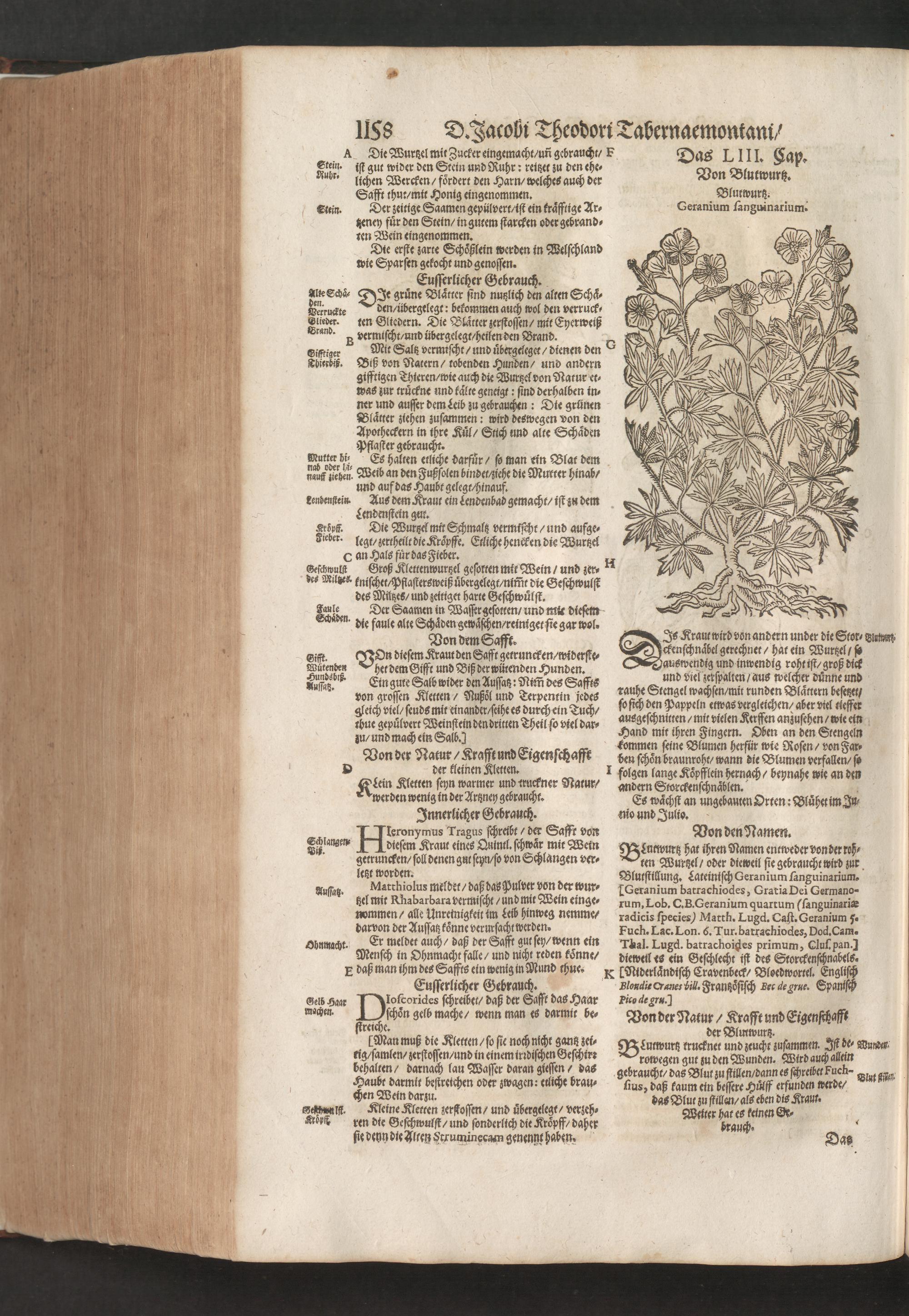 D. Jacobi Theodori Tabernaemontani, Neu vollkommen Kräuter-Buch : Darinnen Uber 3000. Kräuter/ mit schönen und kunstlichen Figuren/ auch deren Underscheid und Würckung/ samt ihren Namen in mancherley Sprachen/ beschrieben: Desgleichen auch/ wie dieselbige in allerhand Kranckheiten/ beyde der Menschen und des Viehs/ sollen angewendet und gebraucht werden/ angezeigt wird. Erstlichen durch Casparum Bauhinum D. und Profess. Basil. mit vielen neuen Figuren/ nutzlichen Artzneyen/ und anderem/ mit sonderem Fleis gebesseret/ Zum Andern Durch Hieronymum Bauhinum D. und Profess. Basil. mit sehr nutzlichen Marginalien, Synonimis, neuen Registeren und anderem vermehrt