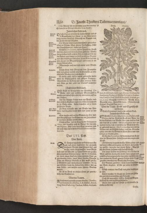 D. Jacobi Theodori Tabernaemontani, Neu vollkommen Kräuter-Buch : Darinnen Uber 3000. Kräuter/ mit schönen und kunstlichen Figuren/ auch deren Underscheid und Würckung/ samt ihren Namen in mancherley Sprachen/ beschrieben: Desgleichen auch/ wie dieselbige in allerhand Kranckheiten/ beyde der Menschen und des Viehs/ sollen angewendet und gebraucht werden/ angezeigt wird. Erstlichen durch Casparum Bauhinum D. und Profess. Basil. mit vielen neuen Figuren/ nutzlichen Artzneyen/ und anderem/ mit sonderem Fleis gebesseret/ Zum Andern Durch Hieronymum Bauhinum D. und Profess. Basil. mit sehr nutzlichen Marginalien, Synonimis, neuen Registeren und anderem vermehrt