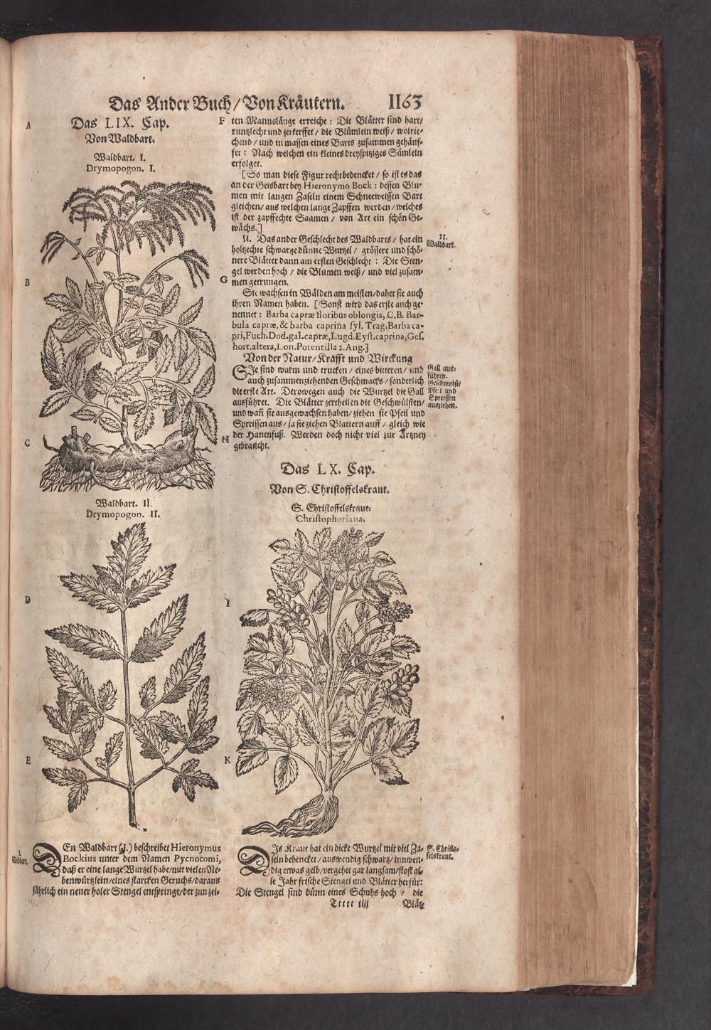 D. Jacobi Theodori Tabernaemontani, Neu vollkommen Kräuter-Buch : Darinnen Uber 3000. Kräuter/ mit schönen und kunstlichen Figuren/ auch deren Underscheid und Würckung/ samt ihren Namen in mancherley Sprachen/ beschrieben: Desgleichen auch/ wie dieselbige in allerhand Kranckheiten/ beyde der Menschen und des Viehs/ sollen angewendet und gebraucht werden/ angezeigt wird. Erstlichen durch Casparum Bauhinum D. und Profess. Basil. mit vielen neuen Figuren/ nutzlichen Artzneyen/ und anderem/ mit sonderem Fleis gebesseret/ Zum Andern Durch Hieronymum Bauhinum D. und Profess. Basil. mit sehr nutzlichen Marginalien, Synonimis, neuen Registeren und anderem vermehrt