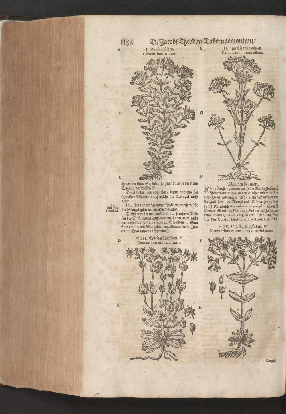 D. Jacobi Theodori Tabernaemontani, Neu vollkommen Kräuter-Buch : Darinnen Uber 3000. Kräuter/ mit schönen und kunstlichen Figuren/ auch deren Underscheid und Würckung/ samt ihren Namen in mancherley Sprachen/ beschrieben: Desgleichen auch/ wie dieselbige in allerhand Kranckheiten/ beyde der Menschen und des Viehs/ sollen angewendet und gebraucht werden/ angezeigt wird. Erstlichen durch Casparum Bauhinum D. und Profess. Basil. mit vielen neuen Figuren/ nutzlichen Artzneyen/ und anderem/ mit sonderem Fleis gebesseret/ Zum Andern Durch Hieronymum Bauhinum D. und Profess. Basil. mit sehr nutzlichen Marginalien, Synonimis, neuen Registeren und anderem vermehrt