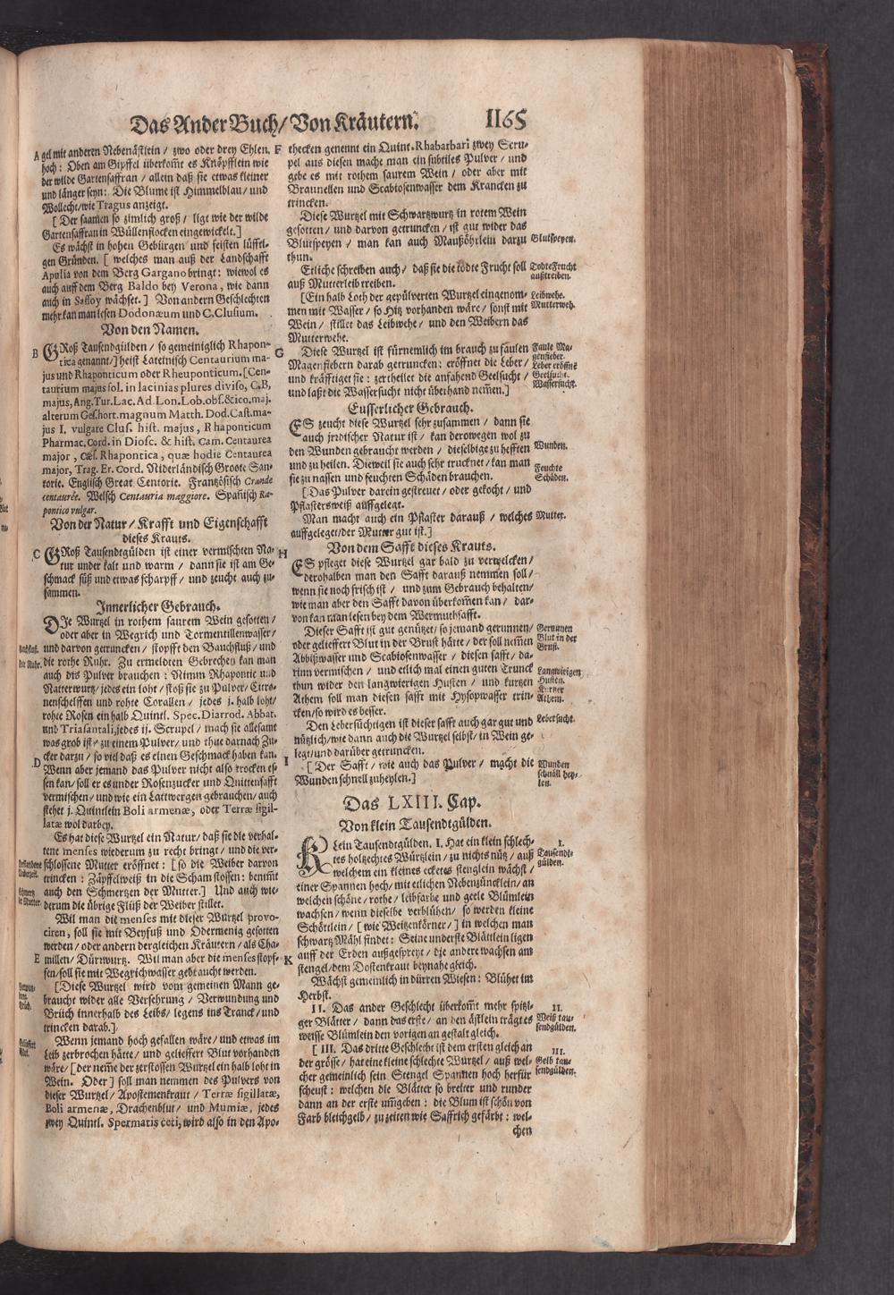 D. Jacobi Theodori Tabernaemontani, Neu vollkommen Kräuter-Buch : Darinnen Uber 3000. Kräuter/ mit schönen und kunstlichen Figuren/ auch deren Underscheid und Würckung/ samt ihren Namen in mancherley Sprachen/ beschrieben: Desgleichen auch/ wie dieselbige in allerhand Kranckheiten/ beyde der Menschen und des Viehs/ sollen angewendet und gebraucht werden/ angezeigt wird. Erstlichen durch Casparum Bauhinum D. und Profess. Basil. mit vielen neuen Figuren/ nutzlichen Artzneyen/ und anderem/ mit sonderem Fleis gebesseret/ Zum Andern Durch Hieronymum Bauhinum D. und Profess. Basil. mit sehr nutzlichen Marginalien, Synonimis, neuen Registeren und anderem vermehrt