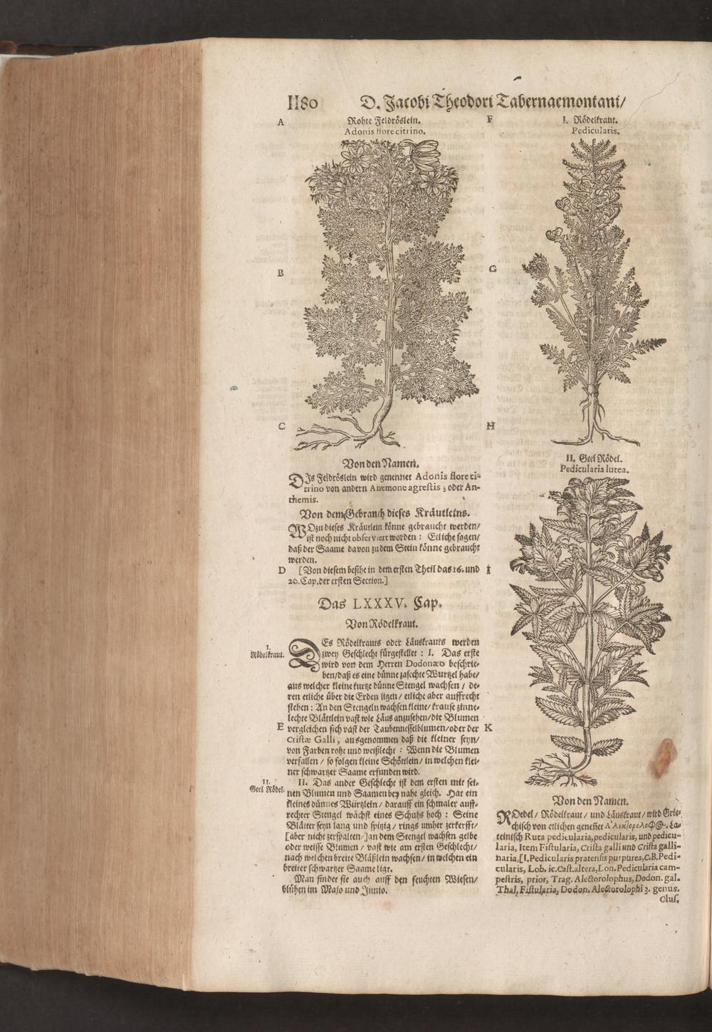 D. Jacobi Theodori Tabernaemontani, Neu vollkommen Kräuter-Buch : Darinnen Uber 3000. Kräuter/ mit schönen und kunstlichen Figuren/ auch deren Underscheid und Würckung/ samt ihren Namen in mancherley Sprachen/ beschrieben: Desgleichen auch/ wie dieselbige in allerhand Kranckheiten/ beyde der Menschen und des Viehs/ sollen angewendet und gebraucht werden/ angezeigt wird. Erstlichen durch Casparum Bauhinum D. und Profess. Basil. mit vielen neuen Figuren/ nutzlichen Artzneyen/ und anderem/ mit sonderem Fleis gebesseret/ Zum Andern Durch Hieronymum Bauhinum D. und Profess. Basil. mit sehr nutzlichen Marginalien, Synonimis, neuen Registeren und anderem vermehrt