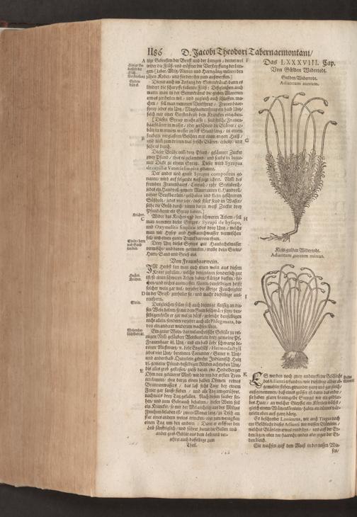 D. Jacobi Theodori Tabernaemontani, Neu vollkommen Kräuter-Buch : Darinnen Uber 3000. Kräuter/ mit schönen und kunstlichen Figuren/ auch deren Underscheid und Würckung/ samt ihren Namen in mancherley Sprachen/ beschrieben: Desgleichen auch/ wie dieselbige in allerhand Kranckheiten/ beyde der Menschen und des Viehs/ sollen angewendet und gebraucht werden/ angezeigt wird. Erstlichen durch Casparum Bauhinum D. und Profess. Basil. mit vielen neuen Figuren/ nutzlichen Artzneyen/ und anderem/ mit sonderem Fleis gebesseret/ Zum Andern Durch Hieronymum Bauhinum D. und Profess. Basil. mit sehr nutzlichen Marginalien, Synonimis, neuen Registeren und anderem vermehrt