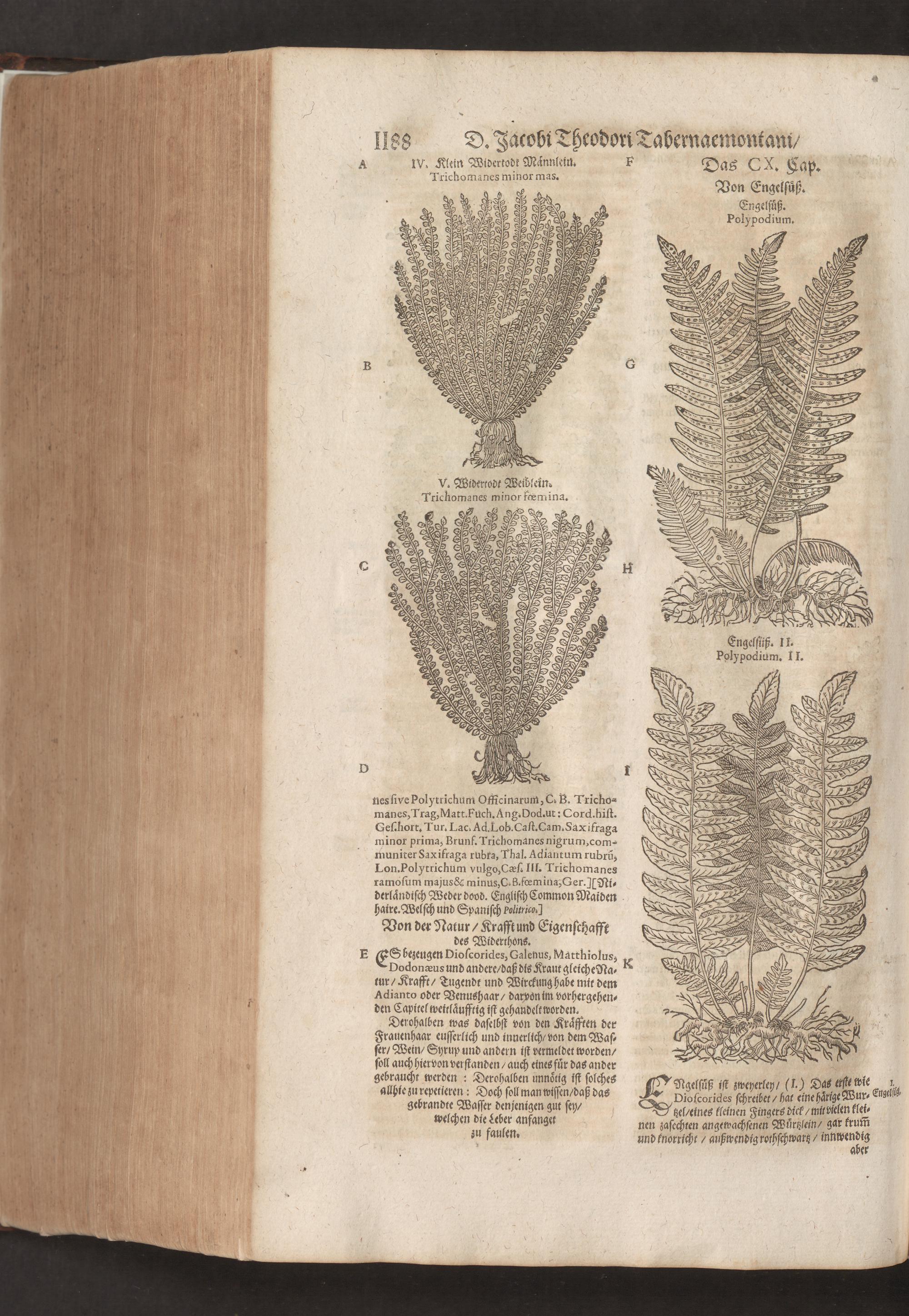 D. Jacobi Theodori Tabernaemontani, Neu vollkommen Kräuter-Buch : Darinnen Uber 3000. Kräuter/ mit schönen und kunstlichen Figuren/ auch deren Underscheid und Würckung/ samt ihren Namen in mancherley Sprachen/ beschrieben: Desgleichen auch/ wie dieselbige in allerhand Kranckheiten/ beyde der Menschen und des Viehs/ sollen angewendet und gebraucht werden/ angezeigt wird. Erstlichen durch Casparum Bauhinum D. und Profess. Basil. mit vielen neuen Figuren/ nutzlichen Artzneyen/ und anderem/ mit sonderem Fleis gebesseret/ Zum Andern Durch Hieronymum Bauhinum D. und Profess. Basil. mit sehr nutzlichen Marginalien, Synonimis, neuen Registeren und anderem vermehrt