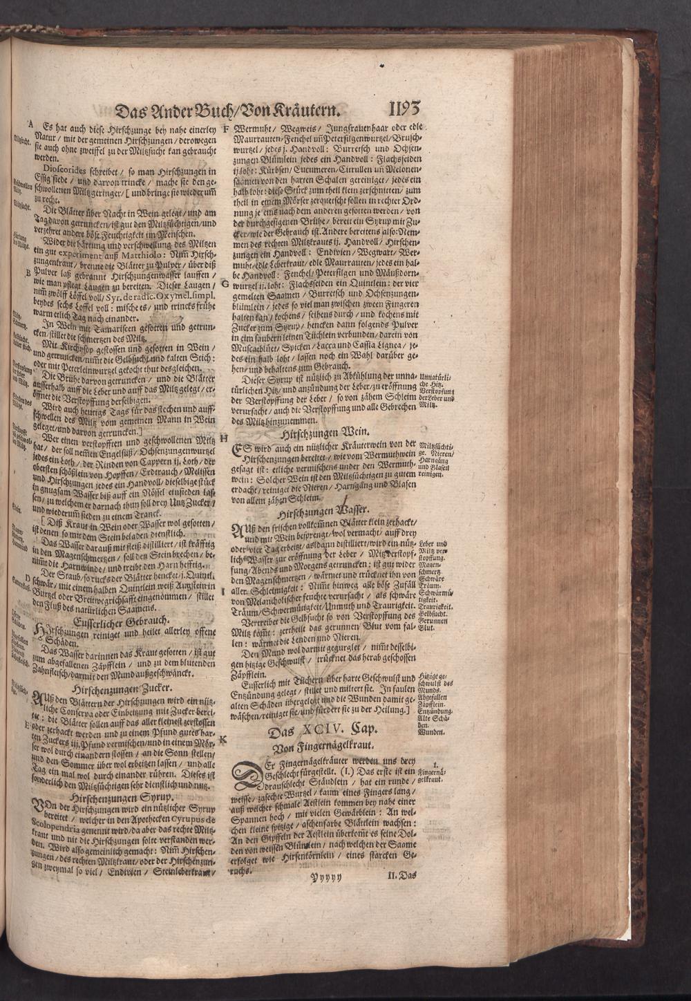 D. Jacobi Theodori Tabernaemontani, Neu vollkommen Kräuter-Buch : Darinnen Uber 3000. Kräuter/ mit schönen und kunstlichen Figuren/ auch deren Underscheid und Würckung/ samt ihren Namen in mancherley Sprachen/ beschrieben: Desgleichen auch/ wie dieselbige in allerhand Kranckheiten/ beyde der Menschen und des Viehs/ sollen angewendet und gebraucht werden/ angezeigt wird. Erstlichen durch Casparum Bauhinum D. und Profess. Basil. mit vielen neuen Figuren/ nutzlichen Artzneyen/ und anderem/ mit sonderem Fleis gebesseret/ Zum Andern Durch Hieronymum Bauhinum D. und Profess. Basil. mit sehr nutzlichen Marginalien, Synonimis, neuen Registeren und anderem vermehrt