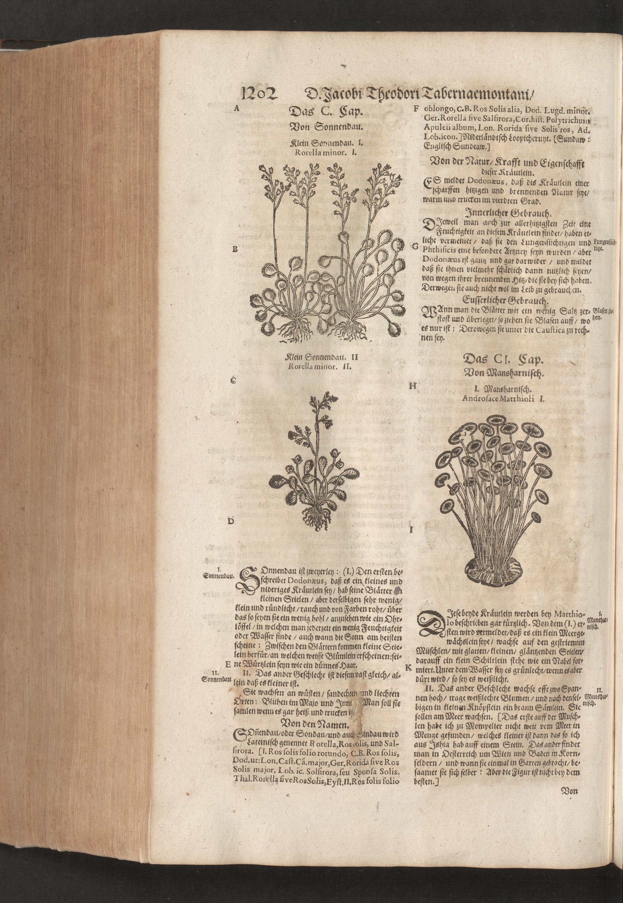 D. Jacobi Theodori Tabernaemontani, Neu vollkommen Kräuter-Buch : Darinnen Uber 3000. Kräuter/ mit schönen und kunstlichen Figuren/ auch deren Underscheid und Würckung/ samt ihren Namen in mancherley Sprachen/ beschrieben: Desgleichen auch/ wie dieselbige in allerhand Kranckheiten/ beyde der Menschen und des Viehs/ sollen angewendet und gebraucht werden/ angezeigt wird. Erstlichen durch Casparum Bauhinum D. und Profess. Basil. mit vielen neuen Figuren/ nutzlichen Artzneyen/ und anderem/ mit sonderem Fleis gebesseret/ Zum Andern Durch Hieronymum Bauhinum D. und Profess. Basil. mit sehr nutzlichen Marginalien, Synonimis, neuen Registeren und anderem vermehrt