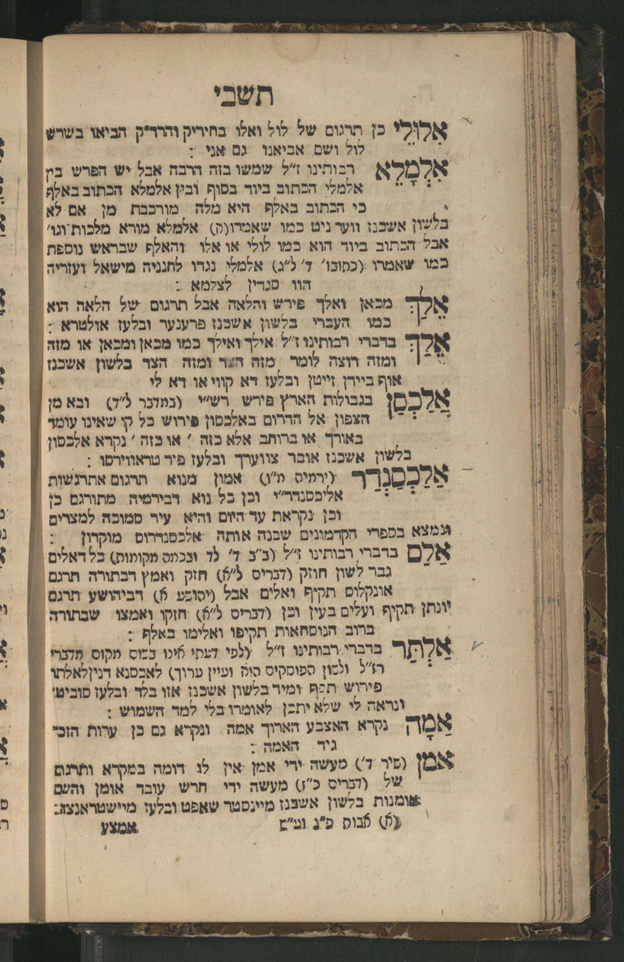 Sefer ha-Tishbi : ha-sefer ha-zeh shorashaṿ be-minyan Tishbi, ṿe-rubam shorashim asher mi-lefanim enam meforashim ... ba-Talmud u-Midrashim ... / mi-kevod ha-rav ha-medaḳdeḳ ... Eli. z.l. ṿe-niḳra ba-shem ṭov R. Eli Baḥur z.l. ... ṿe-ʿatah naʿaśeh be-yeter sheʾat ha-rishonim be-tiḳun ha-marʾeh meḳomot ...ספר התשבי : הספר הזה שרשיו במנין תשבי, ורובם שרשים אשר מלפנים אינם מפורשים בתלמוד ומדרשים ... / מכבוד כבוד הרב המדקדק ... אלי׳ ז״ל ונקרא בשם טוב ר׳ אלי בחור ז״ל ... ועתה נעזה ביתר שאת על הראשונים בתקון המראה מקומת ...