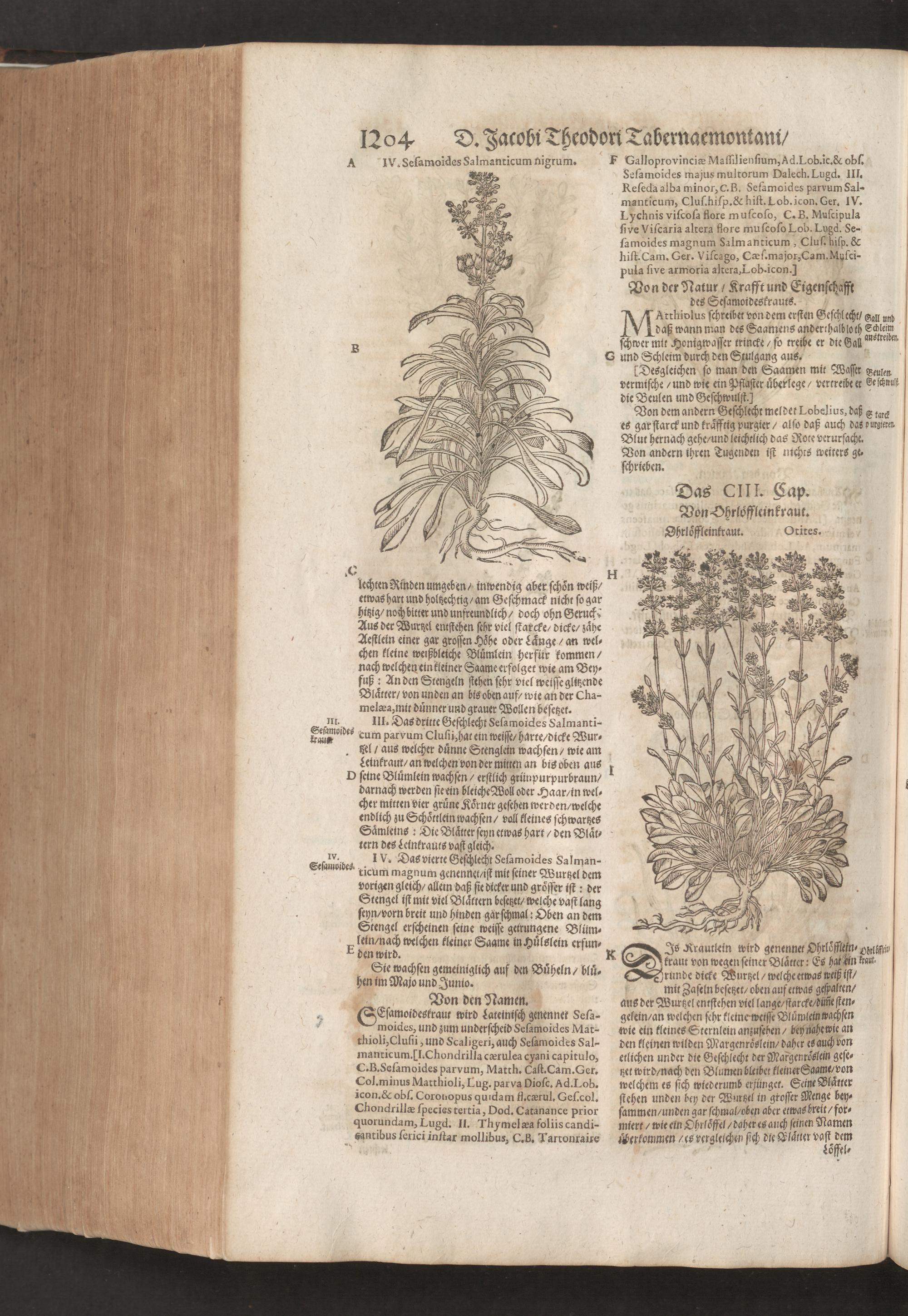 D. Jacobi Theodori Tabernaemontani, Neu vollkommen Kräuter-Buch : Darinnen Uber 3000. Kräuter/ mit schönen und kunstlichen Figuren/ auch deren Underscheid und Würckung/ samt ihren Namen in mancherley Sprachen/ beschrieben: Desgleichen auch/ wie dieselbige in allerhand Kranckheiten/ beyde der Menschen und des Viehs/ sollen angewendet und gebraucht werden/ angezeigt wird. Erstlichen durch Casparum Bauhinum D. und Profess. Basil. mit vielen neuen Figuren/ nutzlichen Artzneyen/ und anderem/ mit sonderem Fleis gebesseret/ Zum Andern Durch Hieronymum Bauhinum D. und Profess. Basil. mit sehr nutzlichen Marginalien, Synonimis, neuen Registeren und anderem vermehrt