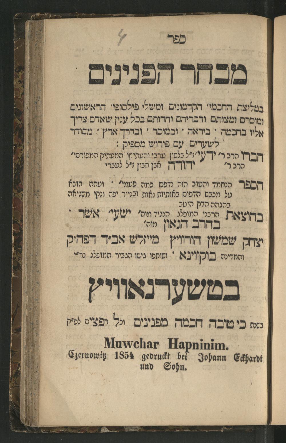 Sefer Mivḥar ha-peninim : bi-melitsat ha-ḥakhme ha-ḳadmonim u-mishle filosofi. ha-rishonim u-musaram u-mitsṿotam ... mesudar le-sheʿarim ʿim perush maspiḳ / ḥibro ha-rav R. Yedaʿy. z.l. bi-leshon ʿArvi ṿe-heʿetiḳo ha-maʿatiḳ ... ha-rav R. Yehuda ibn Tibon z.l. le-ʿIvri ; ha-sefer ... ha-zeh nidpas kamah peʿami. ṿe-ʿatah huva ʿal makhbesh ha-defus ...ספר מבחר הפנינים : במליצת החכמי׳ הקדמונים ומשלי פילסופי׳ הראשונים ומוסרם ומצותם ... מסודר לשערים עם פירוש מספיק / חברו הרב ר׳ ידעי׳ ז״ל בלשון ערבי והעתיקו המעתיק ... הרב ר יהודה אבן תבון ז״ל לעברי ; הספר ... הזה נדפס כמה פעמי׳ ועתה הובא על מכבש הדפוס ...