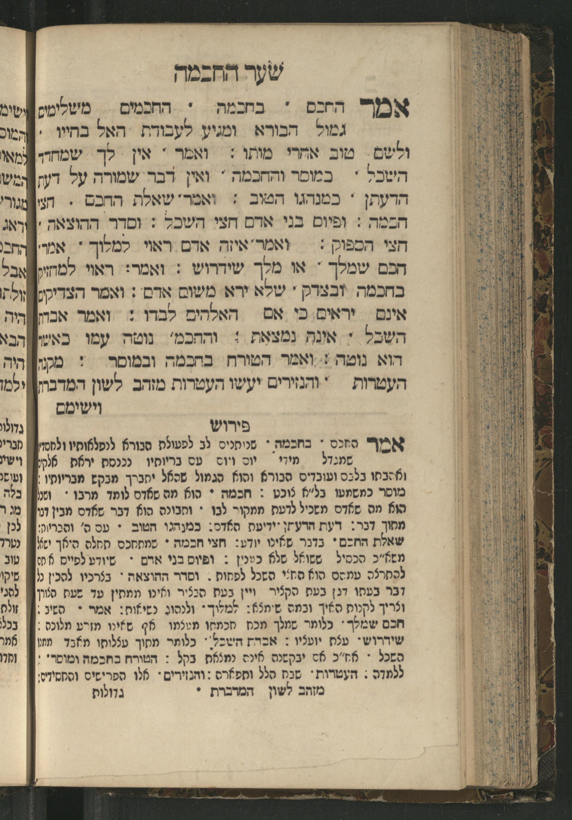Sefer Mivḥar ha-peninim : bi-melitsat ha-ḥakhme ha-ḳadmonim u-mishle filosofi. ha-rishonim u-musaram u-mitsṿotam ... mesudar le-sheʿarim ʿim perush maspiḳ / ḥibro ha-rav R. Yedaʿy. z.l. bi-leshon ʿArvi ṿe-heʿetiḳo ha-maʿatiḳ ... ha-rav R. Yehuda ibn Tibon z.l. le-ʿIvri ; ha-sefer ... ha-zeh nidpas kamah peʿami. ṿe-ʿatah huva ʿal makhbesh ha-defus ...ספר מבחר הפנינים : במליצת החכמי׳ הקדמונים ומשלי פילסופי׳ הראשונים ומוסרם ומצותם ... מסודר לשערים עם פירוש מספיק / חברו הרב ר׳ ידעי׳ ז״ל בלשון ערבי והעתיקו המעתיק ... הרב ר יהודה אבן תבון ז״ל לעברי ; הספר ... הזה נדפס כמה פעמי׳ ועתה הובא על מכבש הדפוס ...