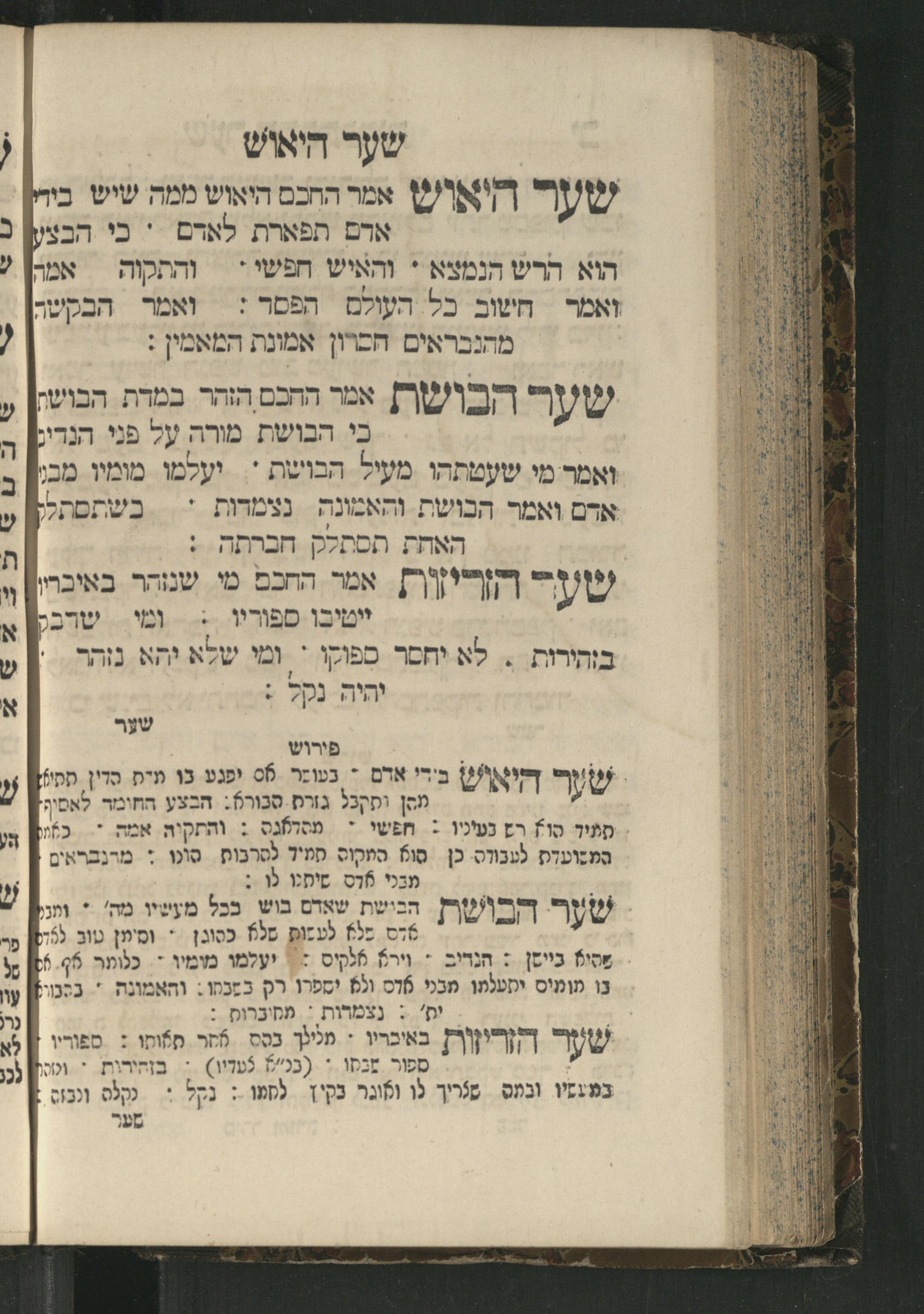 Sefer Mivḥar ha-peninim : bi-melitsat ha-ḥakhme ha-ḳadmonim u-mishle filosofi. ha-rishonim u-musaram u-mitsṿotam ... mesudar le-sheʿarim ʿim perush maspiḳ / ḥibro ha-rav R. Yedaʿy. z.l. bi-leshon ʿArvi ṿe-heʿetiḳo ha-maʿatiḳ ... ha-rav R. Yehuda ibn Tibon z.l. le-ʿIvri ; ha-sefer ... ha-zeh nidpas kamah peʿami. ṿe-ʿatah huva ʿal makhbesh ha-defus ...ספר מבחר הפנינים : במליצת החכמי׳ הקדמונים ומשלי פילסופי׳ הראשונים ומוסרם ומצותם ... מסודר לשערים עם פירוש מספיק / חברו הרב ר׳ ידעי׳ ז״ל בלשון ערבי והעתיקו המעתיק ... הרב ר יהודה אבן תבון ז״ל לעברי ; הספר ... הזה נדפס כמה פעמי׳ ועתה הובא על מכבש הדפוס ...