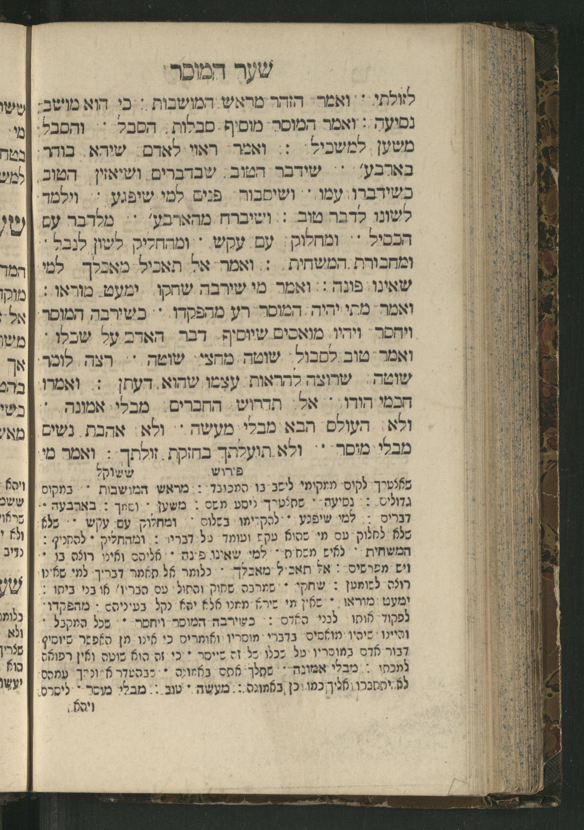 Sefer Mivḥar ha-peninim : bi-melitsat ha-ḥakhme ha-ḳadmonim u-mishle filosofi. ha-rishonim u-musaram u-mitsṿotam ... mesudar le-sheʿarim ʿim perush maspiḳ / ḥibro ha-rav R. Yedaʿy. z.l. bi-leshon ʿArvi ṿe-heʿetiḳo ha-maʿatiḳ ... ha-rav R. Yehuda ibn Tibon z.l. le-ʿIvri ; ha-sefer ... ha-zeh nidpas kamah peʿami. ṿe-ʿatah huva ʿal makhbesh ha-defus ...ספר מבחר הפנינים : במליצת החכמי׳ הקדמונים ומשלי פילסופי׳ הראשונים ומוסרם ומצותם ... מסודר לשערים עם פירוש מספיק / חברו הרב ר׳ ידעי׳ ז״ל בלשון ערבי והעתיקו המעתיק ... הרב ר יהודה אבן תבון ז״ל לעברי ; הספר ... הזה נדפס כמה פעמי׳ ועתה הובא על מכבש הדפוס ...