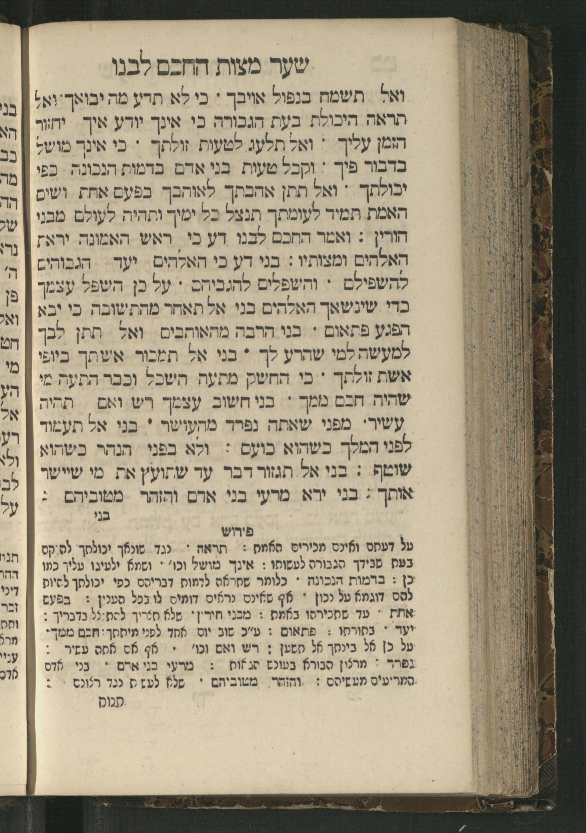 Sefer Mivḥar ha-peninim : bi-melitsat ha-ḥakhme ha-ḳadmonim u-mishle filosofi. ha-rishonim u-musaram u-mitsṿotam ... mesudar le-sheʿarim ʿim perush maspiḳ / ḥibro ha-rav R. Yedaʿy. z.l. bi-leshon ʿArvi ṿe-heʿetiḳo ha-maʿatiḳ ... ha-rav R. Yehuda ibn Tibon z.l. le-ʿIvri ; ha-sefer ... ha-zeh nidpas kamah peʿami. ṿe-ʿatah huva ʿal makhbesh ha-defus ...ספר מבחר הפנינים : במליצת החכמי׳ הקדמונים ומשלי פילסופי׳ הראשונים ומוסרם ומצותם ... מסודר לשערים עם פירוש מספיק / חברו הרב ר׳ ידעי׳ ז״ל בלשון ערבי והעתיקו המעתיק ... הרב ר יהודה אבן תבון ז״ל לעברי ; הספר ... הזה נדפס כמה פעמי׳ ועתה הובא על מכבש הדפוס ...