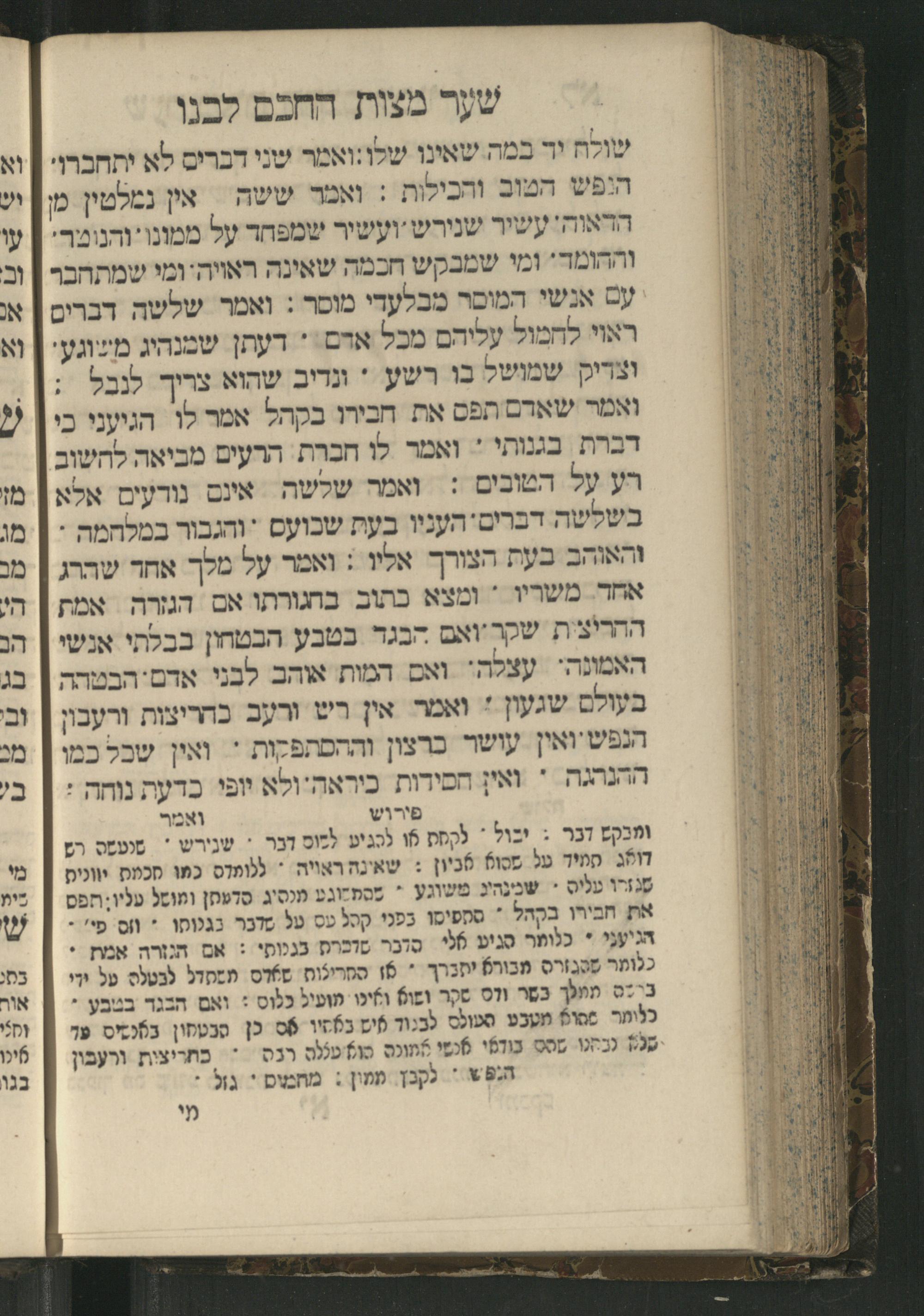Sefer Mivḥar ha-peninim : bi-melitsat ha-ḥakhme ha-ḳadmonim u-mishle filosofi. ha-rishonim u-musaram u-mitsṿotam ... mesudar le-sheʿarim ʿim perush maspiḳ / ḥibro ha-rav R. Yedaʿy. z.l. bi-leshon ʿArvi ṿe-heʿetiḳo ha-maʿatiḳ ... ha-rav R. Yehuda ibn Tibon z.l. le-ʿIvri ; ha-sefer ... ha-zeh nidpas kamah peʿami. ṿe-ʿatah huva ʿal makhbesh ha-defus ...ספר מבחר הפנינים : במליצת החכמי׳ הקדמונים ומשלי פילסופי׳ הראשונים ומוסרם ומצותם ... מסודר לשערים עם פירוש מספיק / חברו הרב ר׳ ידעי׳ ז״ל בלשון ערבי והעתיקו המעתיק ... הרב ר יהודה אבן תבון ז״ל לעברי ; הספר ... הזה נדפס כמה פעמי׳ ועתה הובא על מכבש הדפוס ...