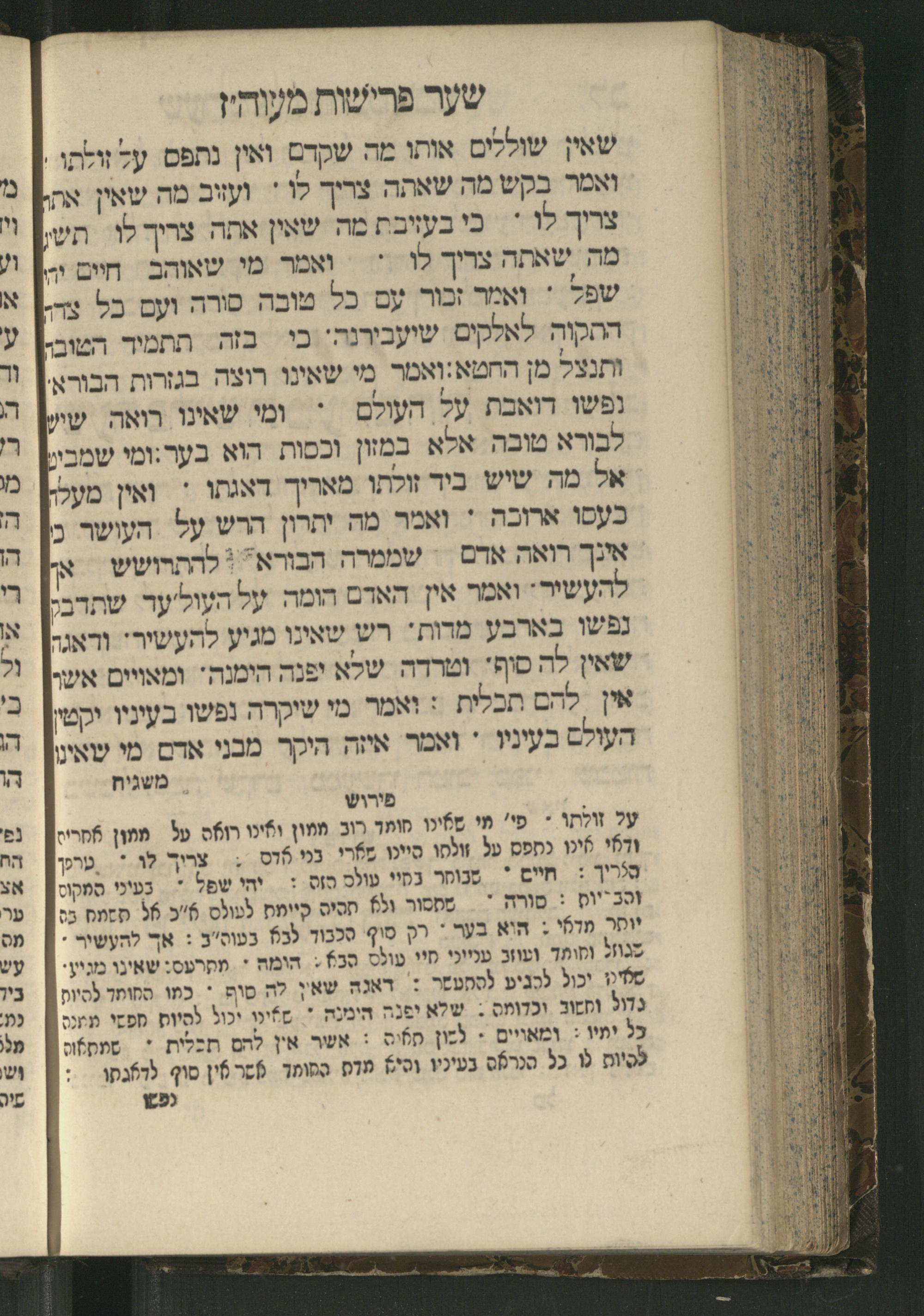 Sefer Mivḥar ha-peninim : bi-melitsat ha-ḥakhme ha-ḳadmonim u-mishle filosofi. ha-rishonim u-musaram u-mitsṿotam ... mesudar le-sheʿarim ʿim perush maspiḳ / ḥibro ha-rav R. Yedaʿy. z.l. bi-leshon ʿArvi ṿe-heʿetiḳo ha-maʿatiḳ ... ha-rav R. Yehuda ibn Tibon z.l. le-ʿIvri ; ha-sefer ... ha-zeh nidpas kamah peʿami. ṿe-ʿatah huva ʿal makhbesh ha-defus ...ספר מבחר הפנינים : במליצת החכמי׳ הקדמונים ומשלי פילסופי׳ הראשונים ומוסרם ומצותם ... מסודר לשערים עם פירוש מספיק / חברו הרב ר׳ ידעי׳ ז״ל בלשון ערבי והעתיקו המעתיק ... הרב ר יהודה אבן תבון ז״ל לעברי ; הספר ... הזה נדפס כמה פעמי׳ ועתה הובא על מכבש הדפוס ...
