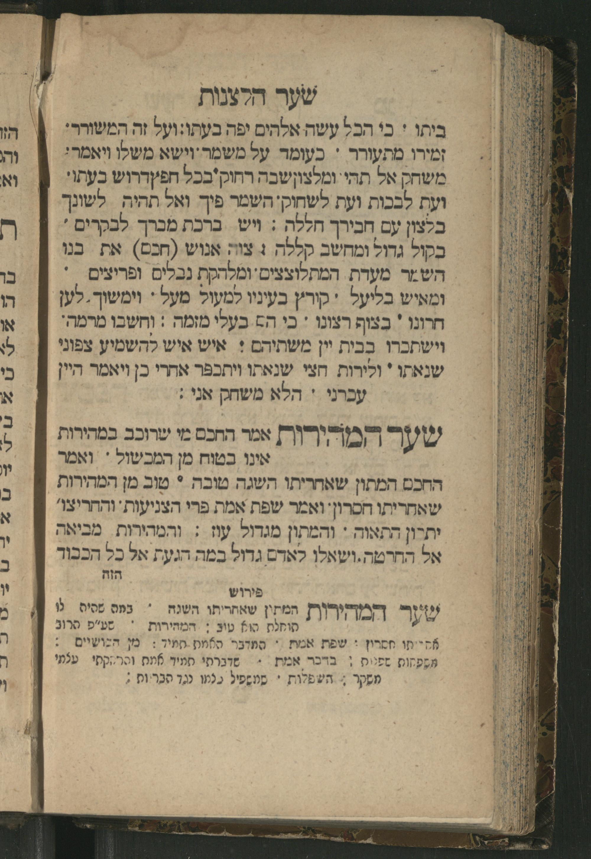 Sefer Mivḥar ha-peninim : bi-melitsat ha-ḥakhme ha-ḳadmonim u-mishle filosofi. ha-rishonim u-musaram u-mitsṿotam ... mesudar le-sheʿarim ʿim perush maspiḳ / ḥibro ha-rav R. Yedaʿy. z.l. bi-leshon ʿArvi ṿe-heʿetiḳo ha-maʿatiḳ ... ha-rav R. Yehuda ibn Tibon z.l. le-ʿIvri ; ha-sefer ... ha-zeh nidpas kamah peʿami. ṿe-ʿatah huva ʿal makhbesh ha-defus ...ספר מבחר הפנינים : במליצת החכמי׳ הקדמונים ומשלי פילסופי׳ הראשונים ומוסרם ומצותם ... מסודר לשערים עם פירוש מספיק / חברו הרב ר׳ ידעי׳ ז״ל בלשון ערבי והעתיקו המעתיק ... הרב ר יהודה אבן תבון ז״ל לעברי ; הספר ... הזה נדפס כמה פעמי׳ ועתה הובא על מכבש הדפוס ...
