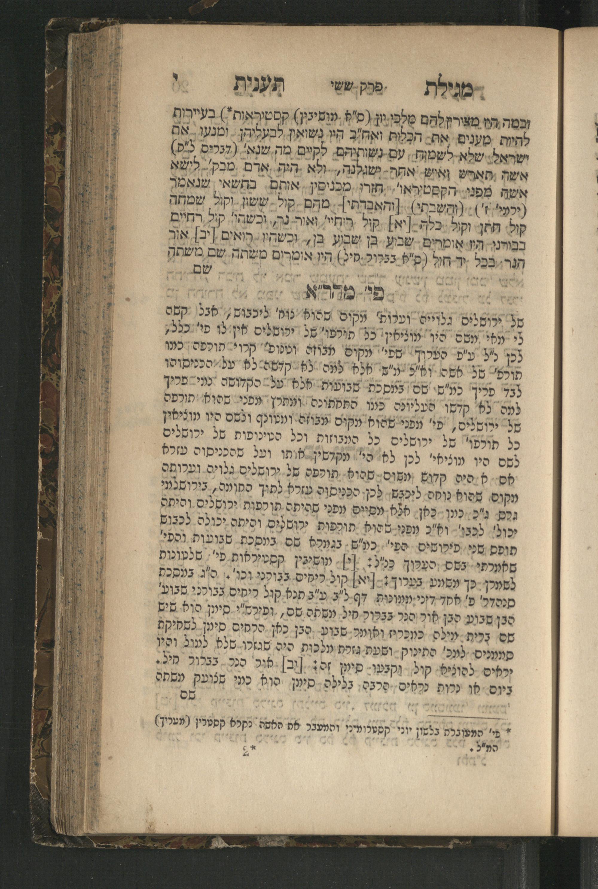 Megilat Taʿanit : hi ha-nodaʿat u-mefursemet mi-yeme ḥakhme ha-Mishnah ṿe-ha-Talmud, ṿe-nikhtevah ʿa.y. Ḥananya ben Ḥizḳiyah ben Guryon ṿe-siʿato ... ʿim pe. meluḳaṭ mi-Bavli ṿi-Yerushalmi u-pe. Rashi ṿe-Tos. / asher asaf ṿe-liḳeṭ ha-Rav ... Avraham Segal z.l. mi-Ḳraḳa niḳra be-shem Perush Mahara, u-ṿe-sofo baʾu ḥidushaṿ ʿal Rashi ṿe-Tos. ; ḥubar lah yaḥad Megilat Anṭiyokhus le-Ḥanukahמגילת תענית : היא הנודעת ומפורסמת מימי חכמי המשנה והתלמוד, ונכתבה ע״י חנניא בן חזקיה בן גריון וסיעתו ... עם פי׳ מלוקט מבבלי וירושלמי ופירש״י ותוס׳ / אשר אסף וליקט הרב ... אברהם סג״ל ז״ל מקראקא נקרא בשם פירוש מהר״א, ובסופו באו חדושיו על רש״י ותוס׳ ; חובר לה יחד מגילת אנטיוכוס לחנוכה