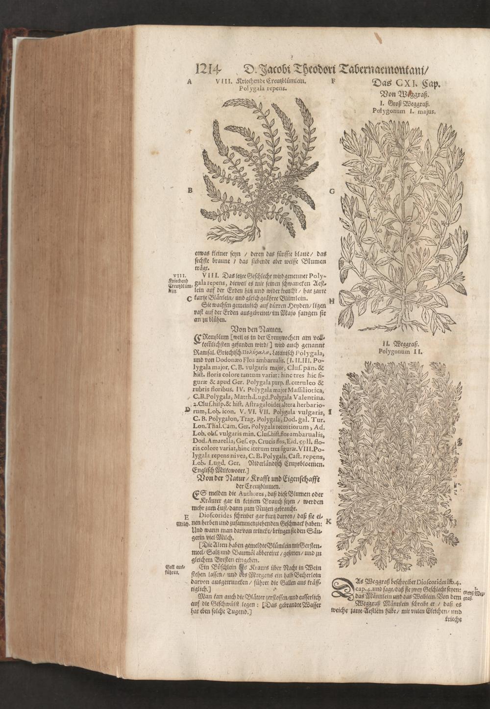 D. Jacobi Theodori Tabernaemontani, Neu vollkommen Kräuter-Buch : Darinnen Uber 3000. Kräuter/ mit schönen und kunstlichen Figuren/ auch deren Underscheid und Würckung/ samt ihren Namen in mancherley Sprachen/ beschrieben: Desgleichen auch/ wie dieselbige in allerhand Kranckheiten/ beyde der Menschen und des Viehs/ sollen angewendet und gebraucht werden/ angezeigt wird. Erstlichen durch Casparum Bauhinum D. und Profess. Basil. mit vielen neuen Figuren/ nutzlichen Artzneyen/ und anderem/ mit sonderem Fleis gebesseret/ Zum Andern Durch Hieronymum Bauhinum D. und Profess. Basil. mit sehr nutzlichen Marginalien, Synonimis, neuen Registeren und anderem vermehrt