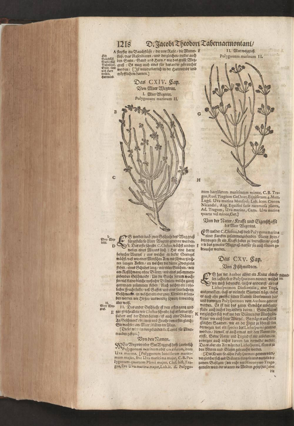 D. Jacobi Theodori Tabernaemontani, Neu vollkommen Kräuter-Buch : Darinnen Uber 3000. Kräuter/ mit schönen und kunstlichen Figuren/ auch deren Underscheid und Würckung/ samt ihren Namen in mancherley Sprachen/ beschrieben: Desgleichen auch/ wie dieselbige in allerhand Kranckheiten/ beyde der Menschen und des Viehs/ sollen angewendet und gebraucht werden/ angezeigt wird. Erstlichen durch Casparum Bauhinum D. und Profess. Basil. mit vielen neuen Figuren/ nutzlichen Artzneyen/ und anderem/ mit sonderem Fleis gebesseret/ Zum Andern Durch Hieronymum Bauhinum D. und Profess. Basil. mit sehr nutzlichen Marginalien, Synonimis, neuen Registeren und anderem vermehrt