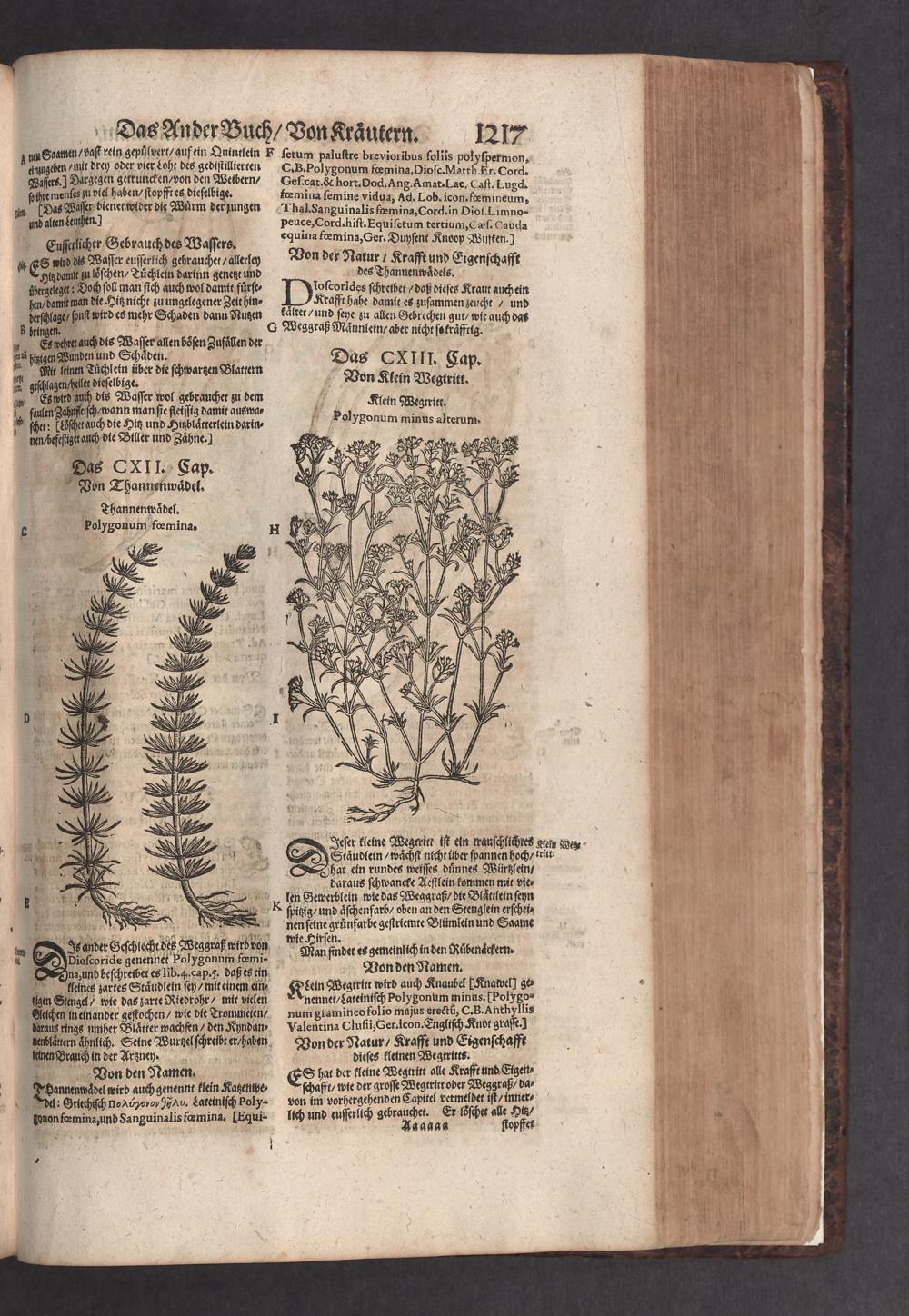 D. Jacobi Theodori Tabernaemontani, Neu vollkommen Kräuter-Buch : Darinnen Uber 3000. Kräuter/ mit schönen und kunstlichen Figuren/ auch deren Underscheid und Würckung/ samt ihren Namen in mancherley Sprachen/ beschrieben: Desgleichen auch/ wie dieselbige in allerhand Kranckheiten/ beyde der Menschen und des Viehs/ sollen angewendet und gebraucht werden/ angezeigt wird. Erstlichen durch Casparum Bauhinum D. und Profess. Basil. mit vielen neuen Figuren/ nutzlichen Artzneyen/ und anderem/ mit sonderem Fleis gebesseret/ Zum Andern Durch Hieronymum Bauhinum D. und Profess. Basil. mit sehr nutzlichen Marginalien, Synonimis, neuen Registeren und anderem vermehrt