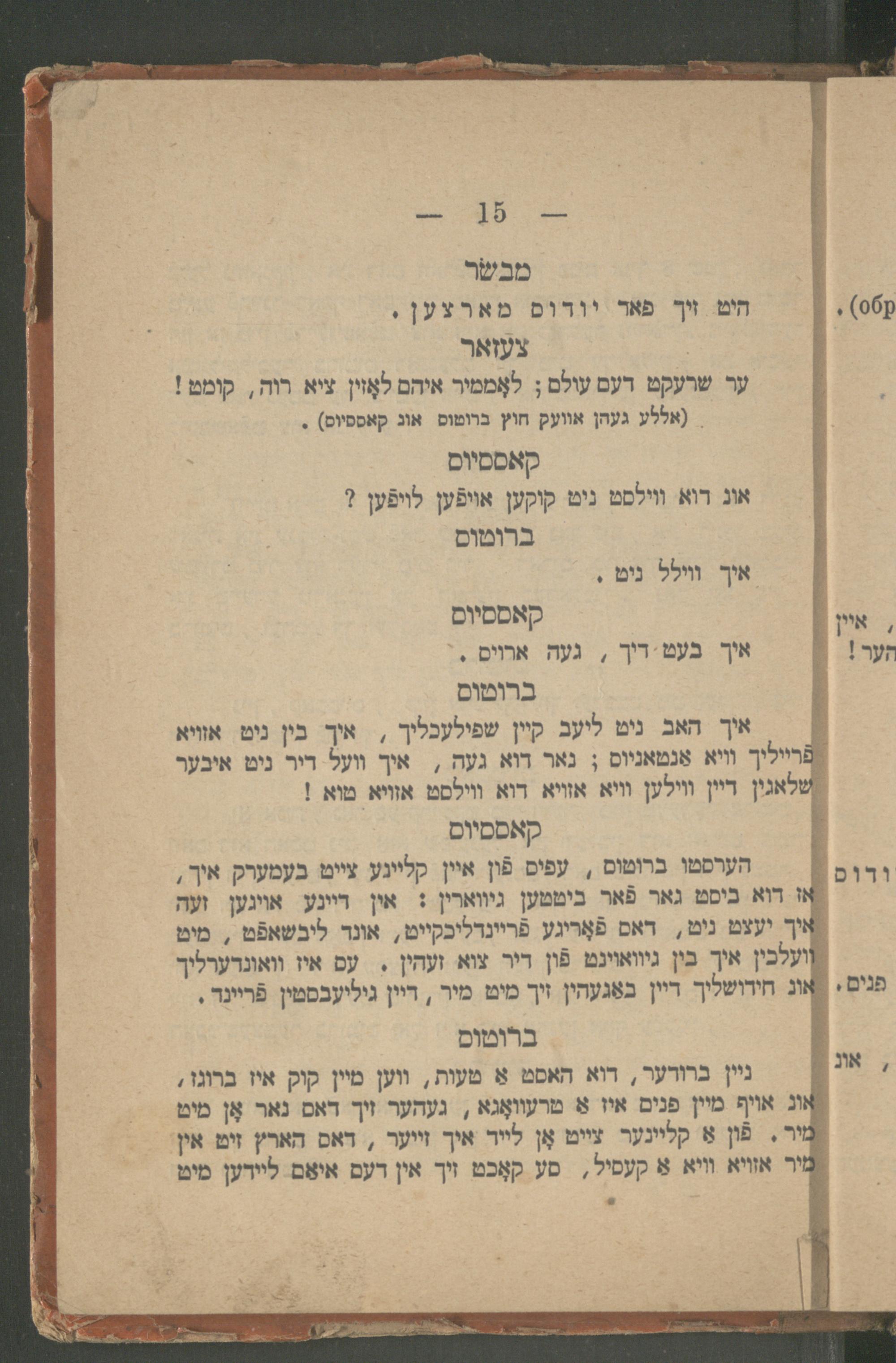 Yulyus Tsezar : eyne isṭorishe ṭrahedishe drama : iber Romaʹr respobliḳe in 5 ershaynungen / ferfasṭ fon dem berihmṭen dikhṭer un dramaṭurg Ṿillyam Sheḳsper ; fray iberzeṭsṭ un bearbeyṭeṭ ins prost yudishen zshargon fon Betsalʾel Ṿishnipolsḳiיוליוס צעזאר : איינע איסטארישע, טראהעדישע דראמא : איבער רומאʹר רעספאבליקע אין 5 ערשיינונגען / פערפאסט פאן דעם בעריהמטען דיכטער אונ דראמאטורג ווילליאם שעקספער ; פרייא איבערזעטצט אונ בעארבייטעט אינס פראסט יודישען זשארגאן פאן בצלאל ווישניפאלסקי