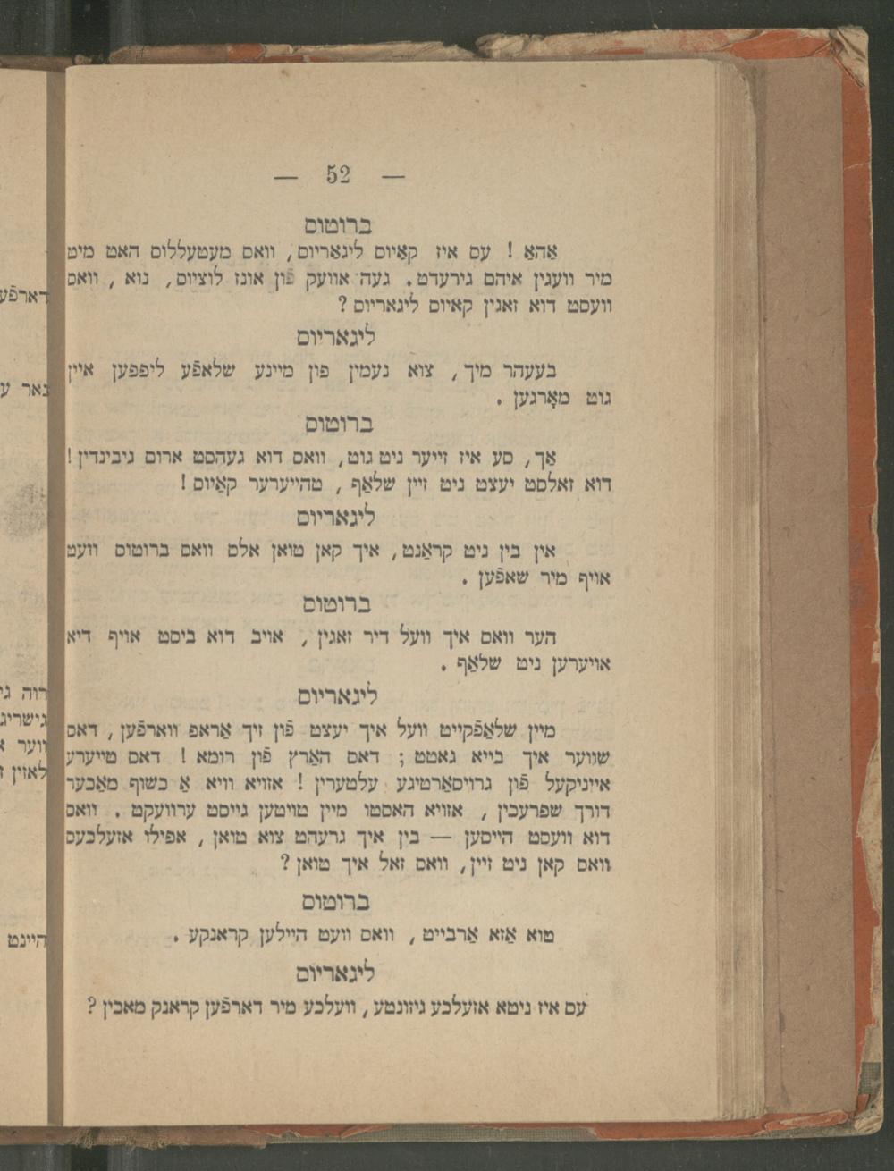 Yulyus Tsezar : eyne isṭorishe ṭrahedishe drama : iber Romaʹr respobliḳe in 5 ershaynungen / ferfasṭ fon dem berihmṭen dikhṭer un dramaṭurg Ṿillyam Sheḳsper ; fray iberzeṭsṭ un bearbeyṭeṭ ins prost yudishen zshargon fon Betsalʾel Ṿishnipolsḳiיוליוס צעזאר : איינע איסטארישע, טראהעדישע דראמא : איבער רומאʹר רעספאבליקע אין 5 ערשיינונגען / פערפאסט פאן דעם בעריהמטען דיכטער אונ דראמאטורג ווילליאם שעקספער ; פרייא איבערזעטצט אונ בעארבייטעט אינס פראסט יודישען זשארגאן פאן בצלאל ווישניפאלסקי