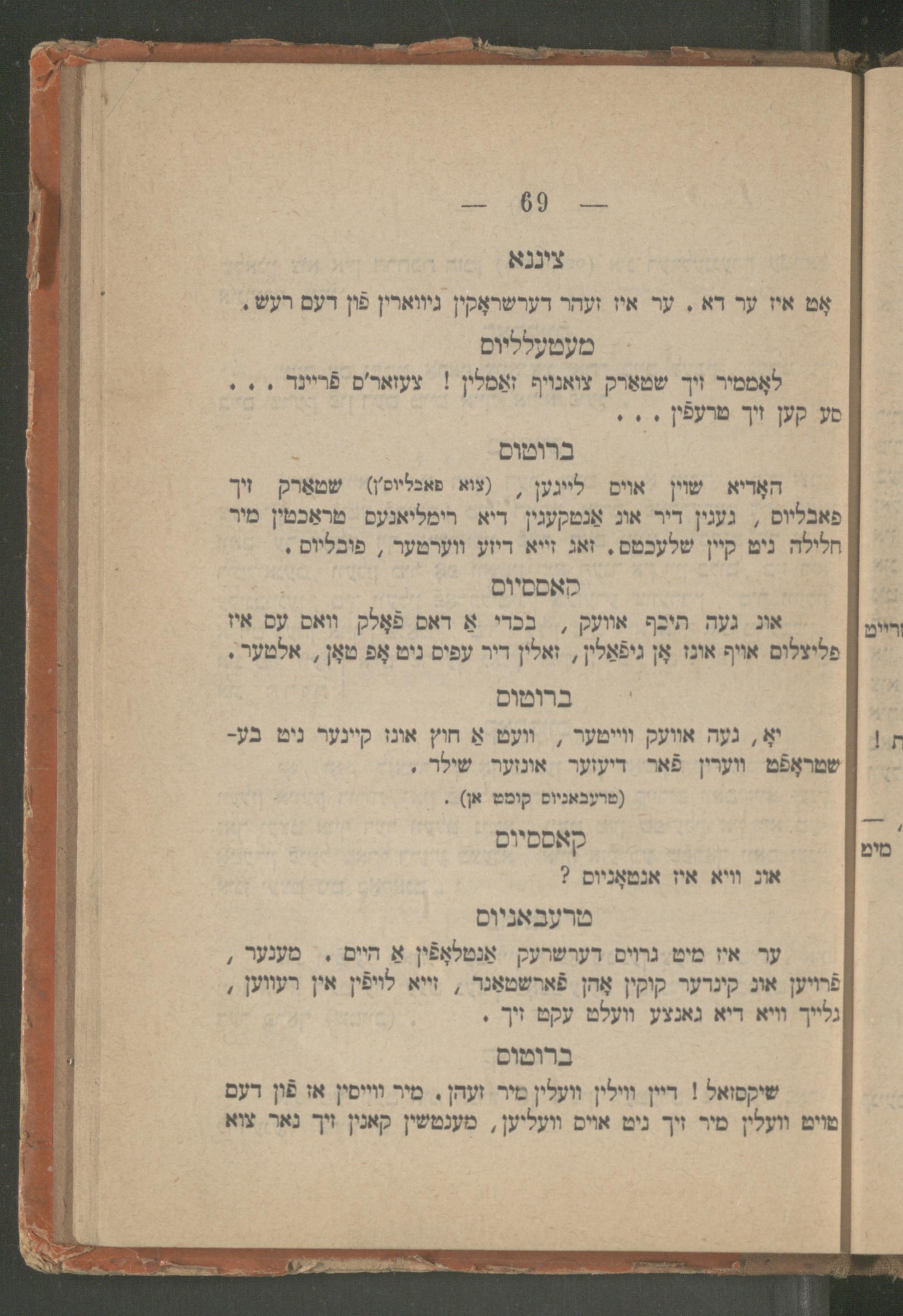 Yulyus Tsezar : eyne isṭorishe ṭrahedishe drama : iber Romaʹr respobliḳe in 5 ershaynungen / ferfasṭ fon dem berihmṭen dikhṭer un dramaṭurg Ṿillyam Sheḳsper ; fray iberzeṭsṭ un bearbeyṭeṭ ins prost yudishen zshargon fon Betsalʾel Ṿishnipolsḳiיוליוס צעזאר : איינע איסטארישע, טראהעדישע דראמא : איבער רומאʹר רעספאבליקע אין 5 ערשיינונגען / פערפאסט פאן דעם בעריהמטען דיכטער אונ דראמאטורג ווילליאם שעקספער ; פרייא איבערזעטצט אונ בעארבייטעט אינס פראסט יודישען זשארגאן פאן בצלאל ווישניפאלסקי